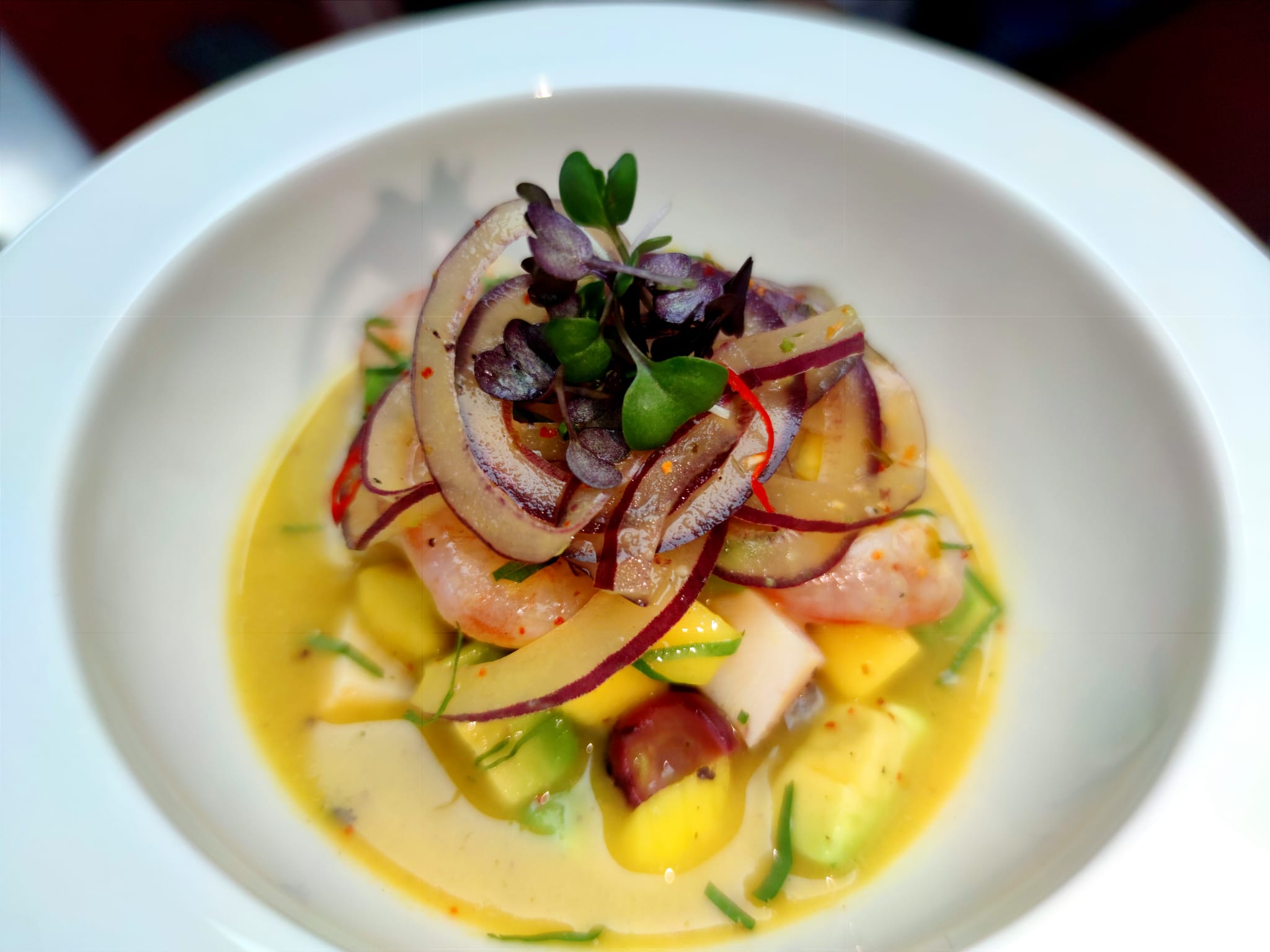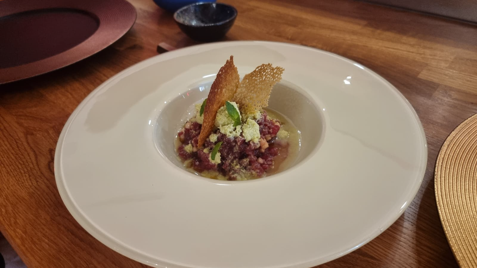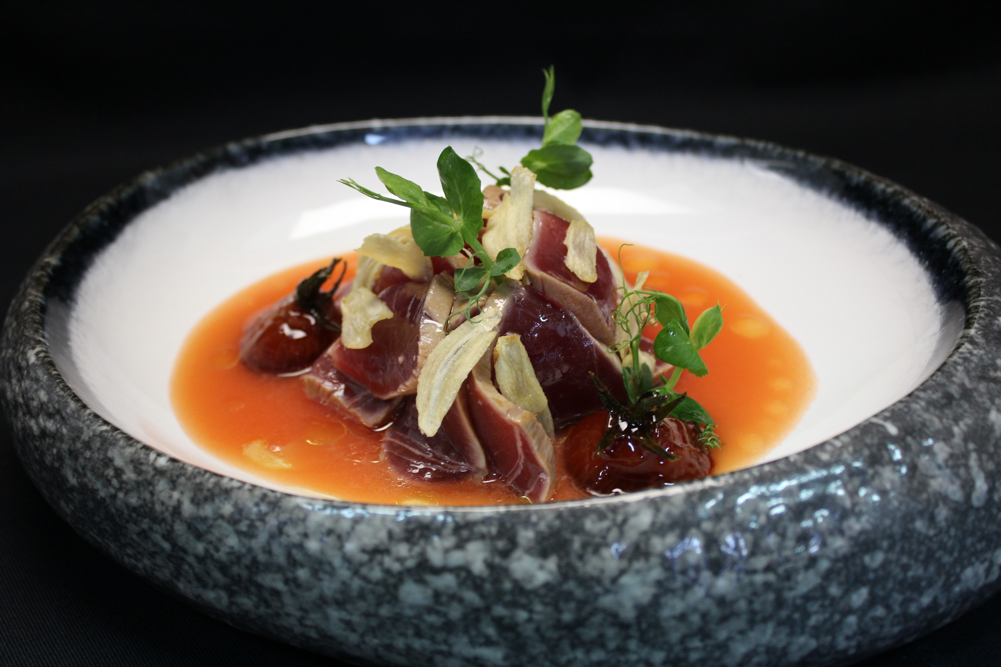 UN PLATO CON UN SUAVE AROMA A AHUMADO. SE TRATA DE FINAS LONCHAS DE ATUN ROJO LIGERAMENTE MARCADO A FUEGO PRESENTADO SOBRE CALDO DE TOMATE ASADO, TOMATITO CARAMELO Y CHIPS DE AJO. - 19,00€