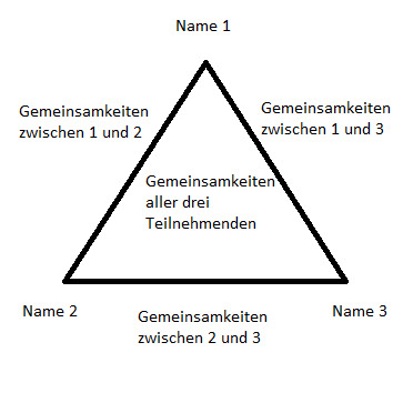 So geht's: Die Teilnehmenden werden in Dreiergruppen eingeteilt und sollen sich zu einer bestimmten Fragestellung austauschen. Meist bezieht sich die Fragestellung auf persönliche Erfahrungen. Anschließend werden Gemeinsamkeiten z.B. auf einem Flipchart oder einem Whiteboard, auf dem bereits ein Dreieck eingezeichnet ist, gesammelt. An jeder Spitze des Dreiecks wird der Name je eines Teilnehmenden notiert. An den Seiten des Dreiecks werden nun Gemeinsamkeiten der jeweils beiden außen stehenden Teilnehmenden gesammelt und in der Mitte die Gemeinsamkeiten aller Teilnehmenden. Die Methode lässt sich übrigens auch einsetzen, wenn sich die Gruppe nicht in Dreiergruppen teilen lässt: Ein Viereck der Gemeinsamkeiten funktioniert genauso gut.