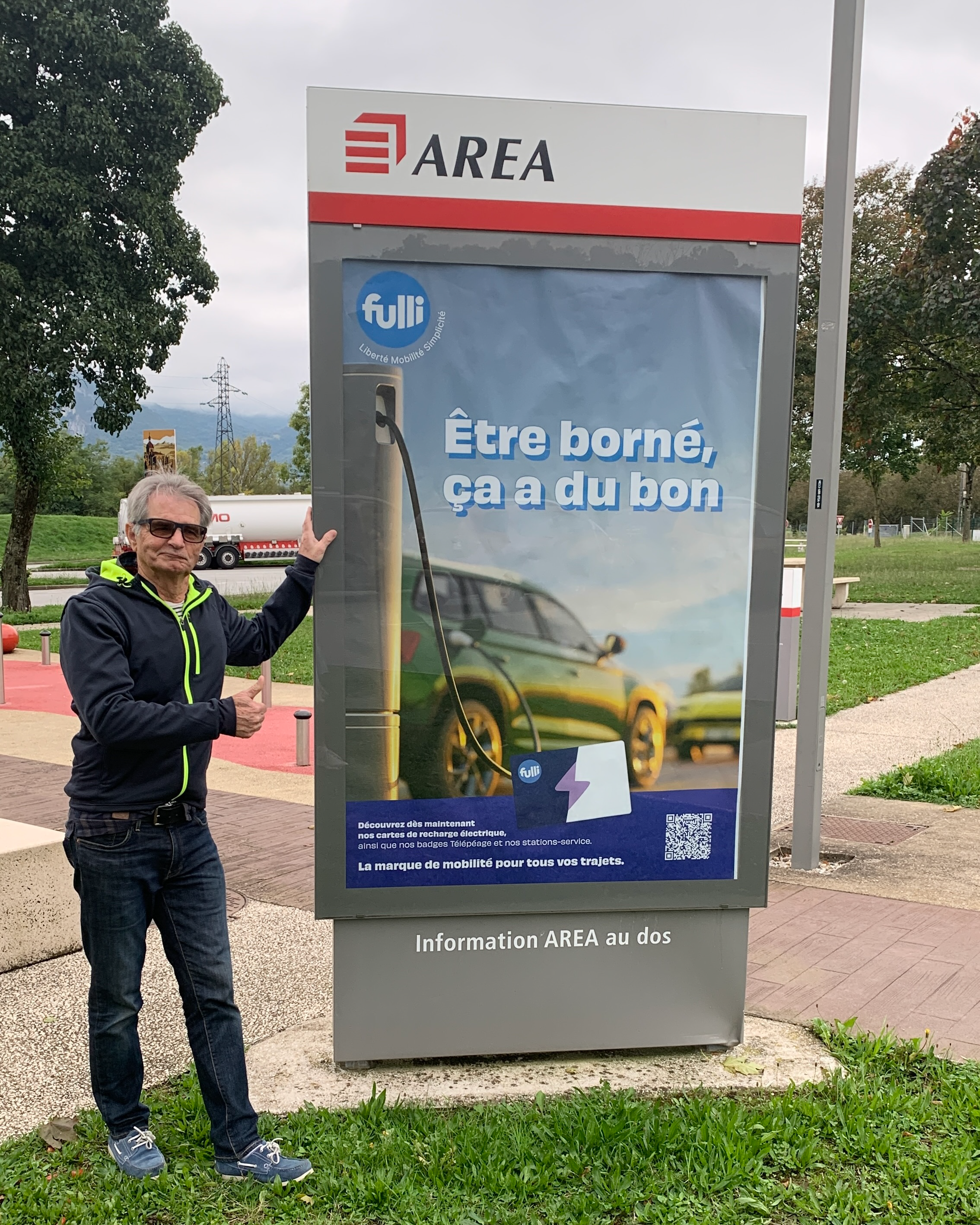 Aire de Montélimar, une affiche rien que pour Claude, mais borné non pas des recharges électriques, mais des bornes historiques.