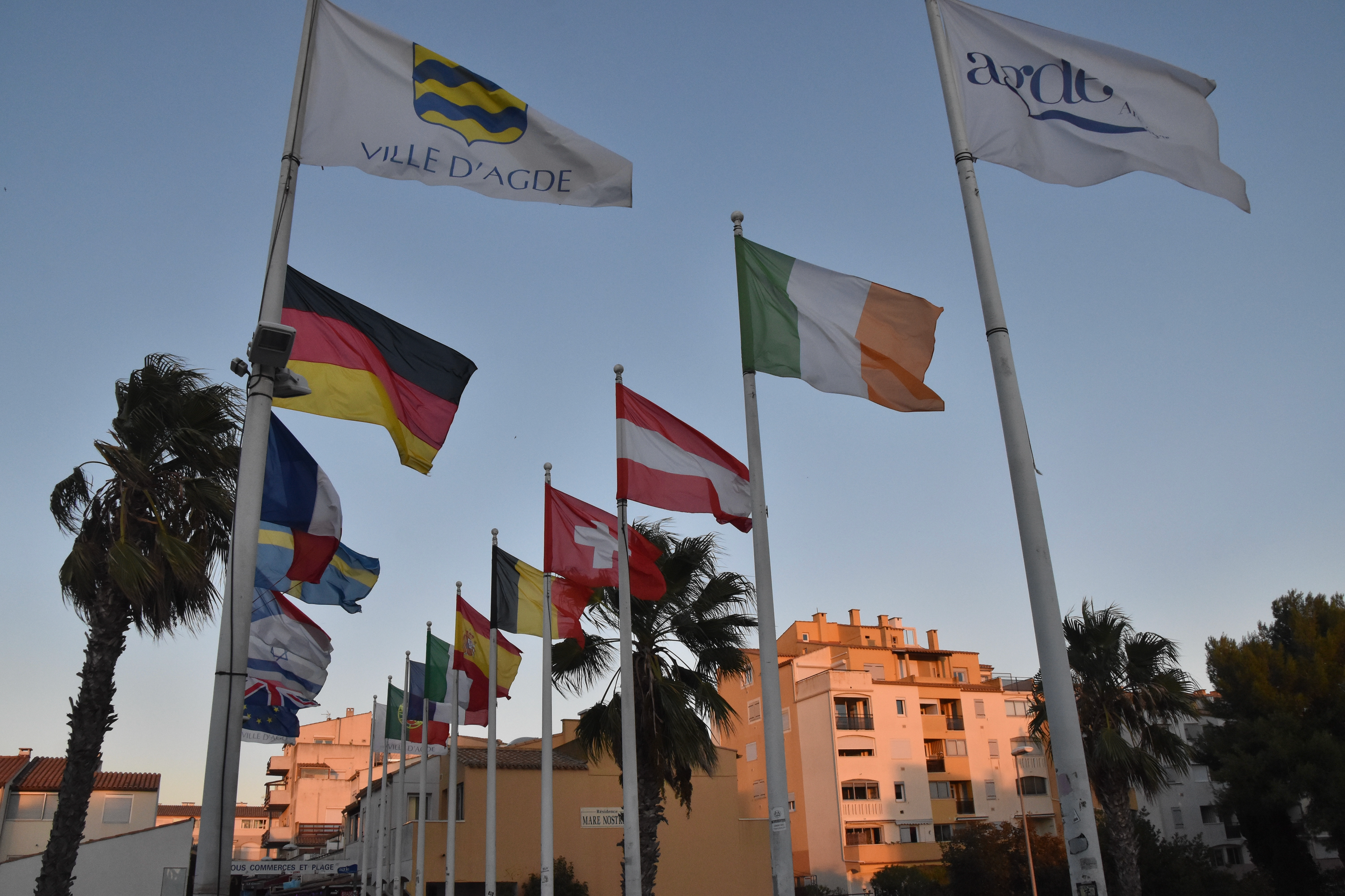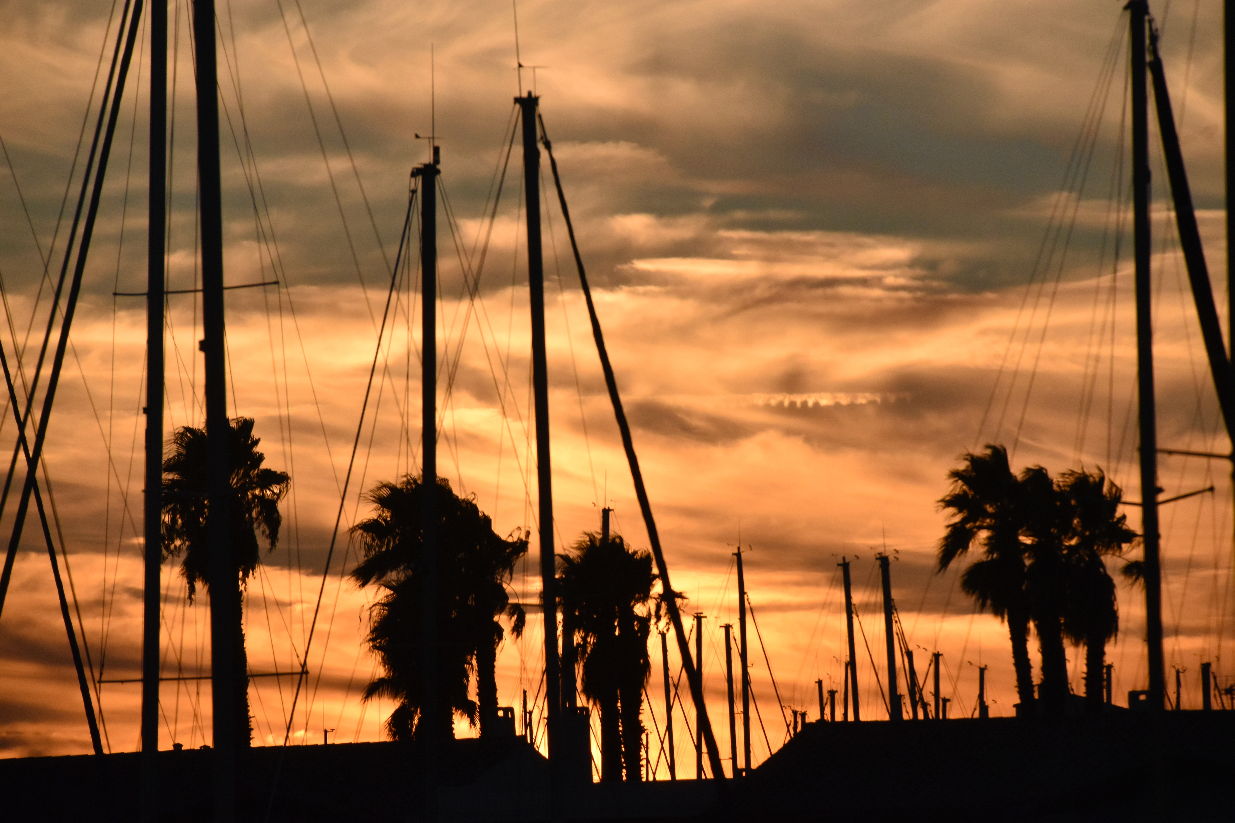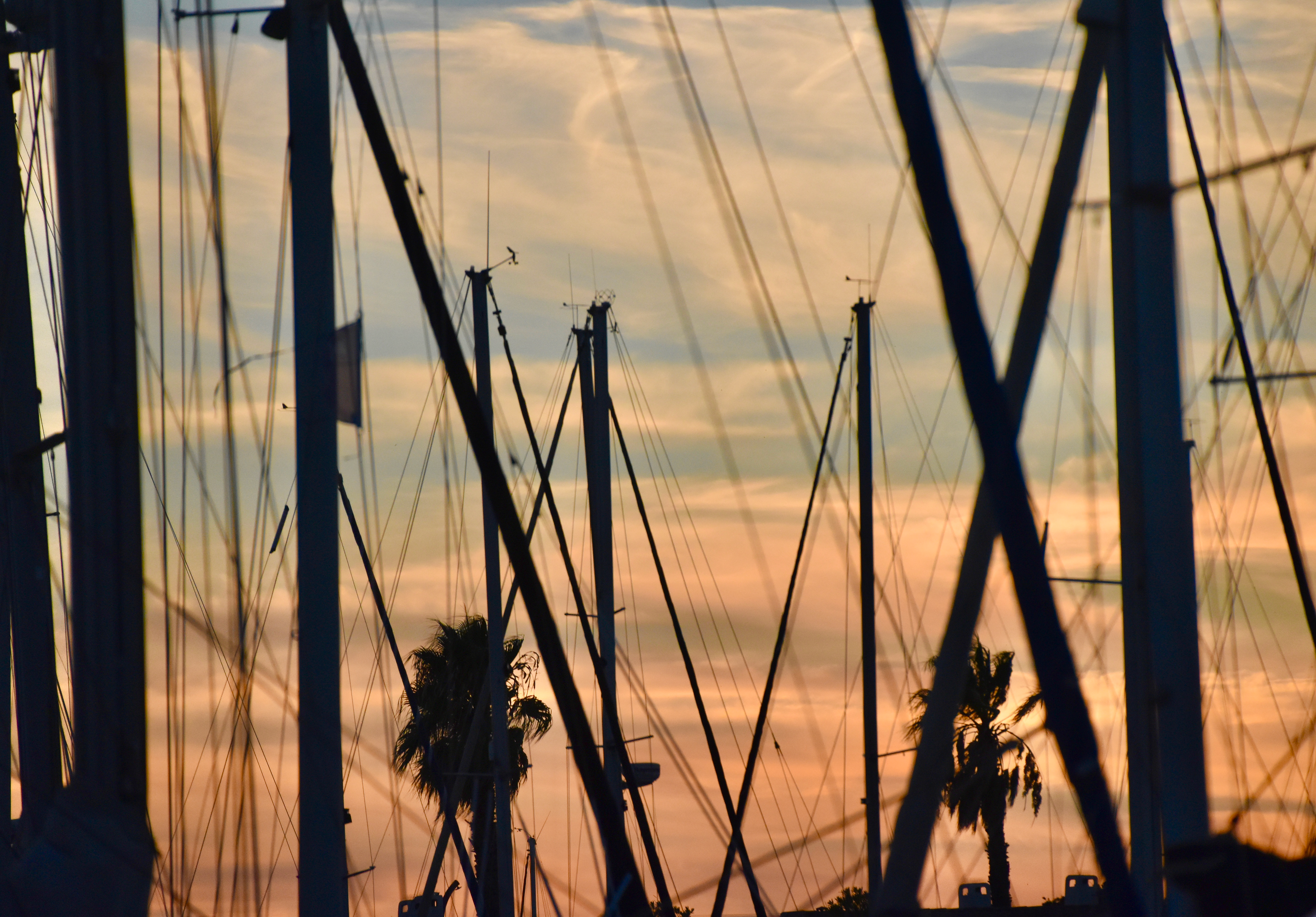 Les couleurs du soir à travers mâts dressés et palmiers échevelés. Le vent souffle avec violence, 30 km/h paraît-il ! Aïe pour demain où il faudra obligatoirement rouler à contre dans un des sens le long de l’étang de Thau..