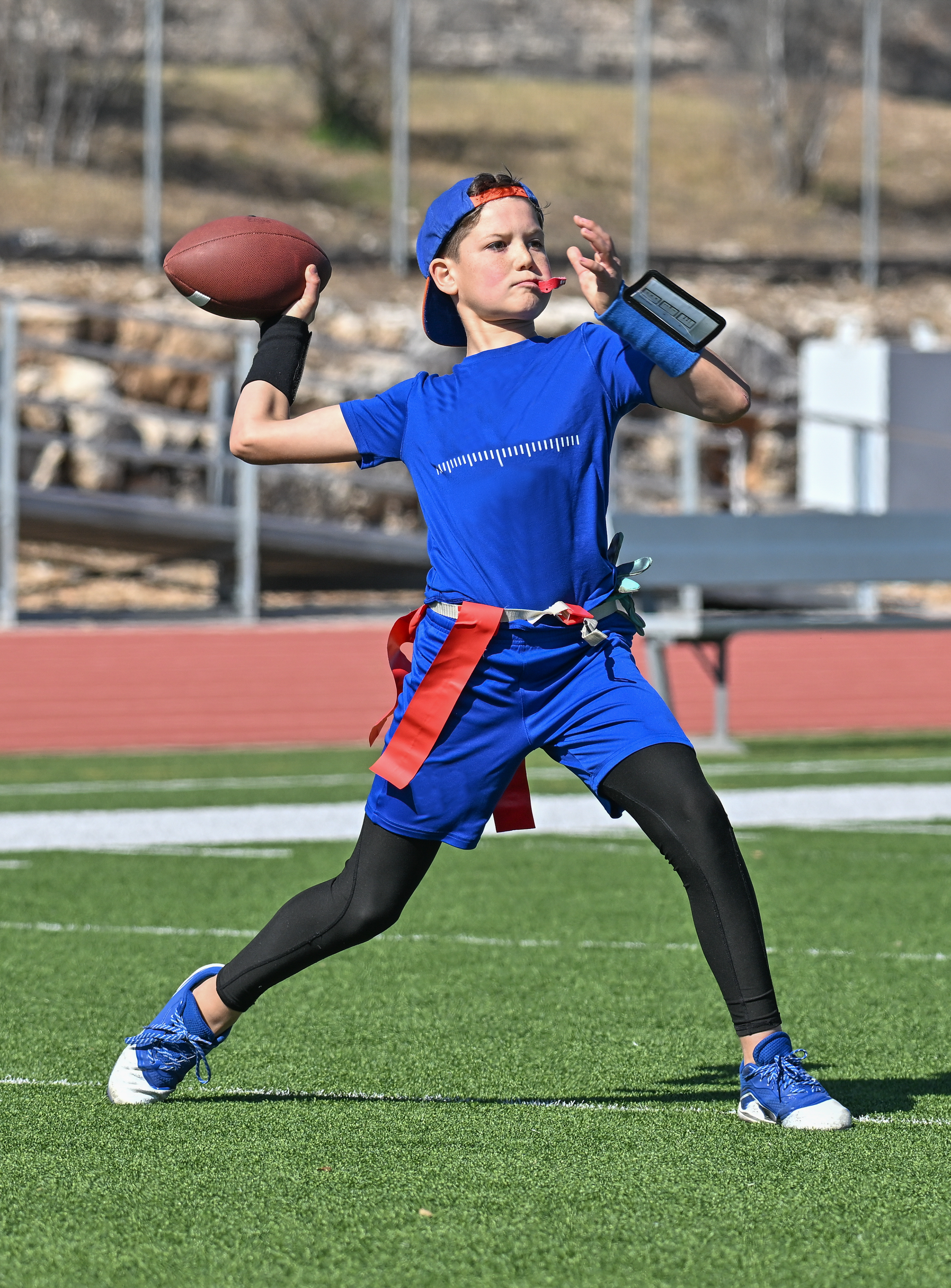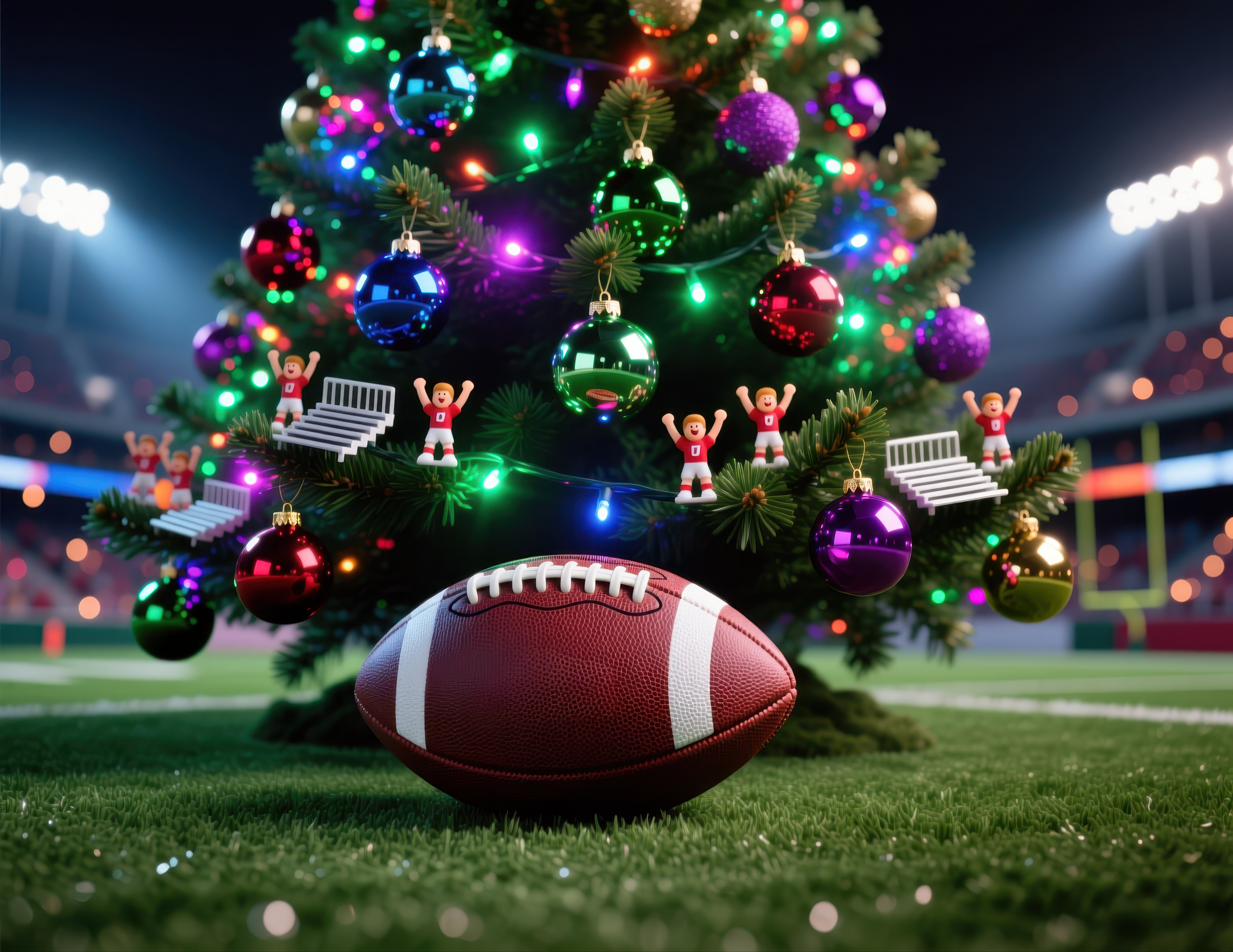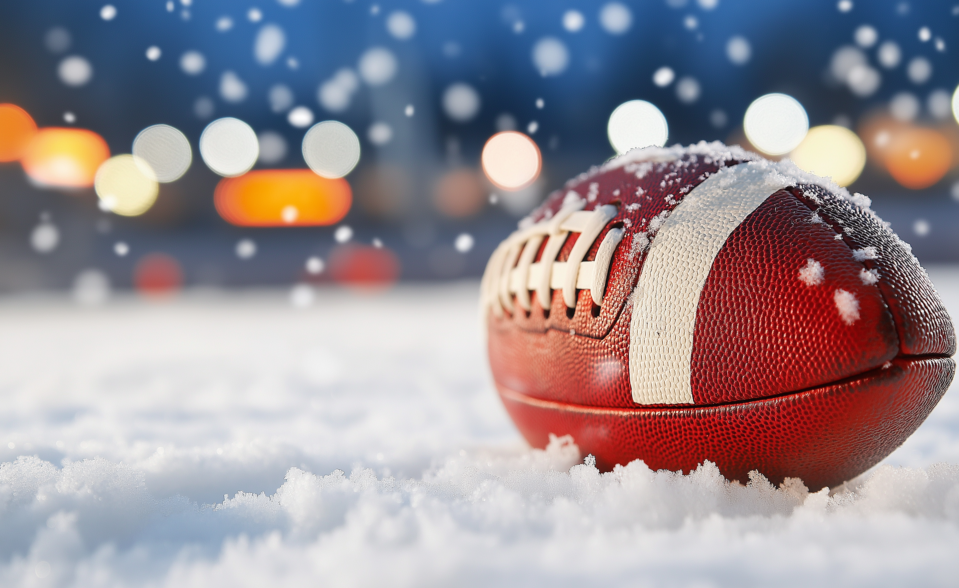 Created with images by Curioso.Photography - "American football resting on snowy ground with blurred bokeh lights in the background, creating a winter sports atmosphere." • Sanya Kushak - "Flag Football Equipment on Green Turf.,White belts with red and blue flags used for playing flag football.,A football lays to the side.,Set against the white and green turf of a football field." • LIDIIA - "American football on a stadium field with a decorated Christmas tree at night." • Joe - "Girls playing flag football during a powder puff game" • Joe - "Young boy throwing and running with the ball during a flag football game"