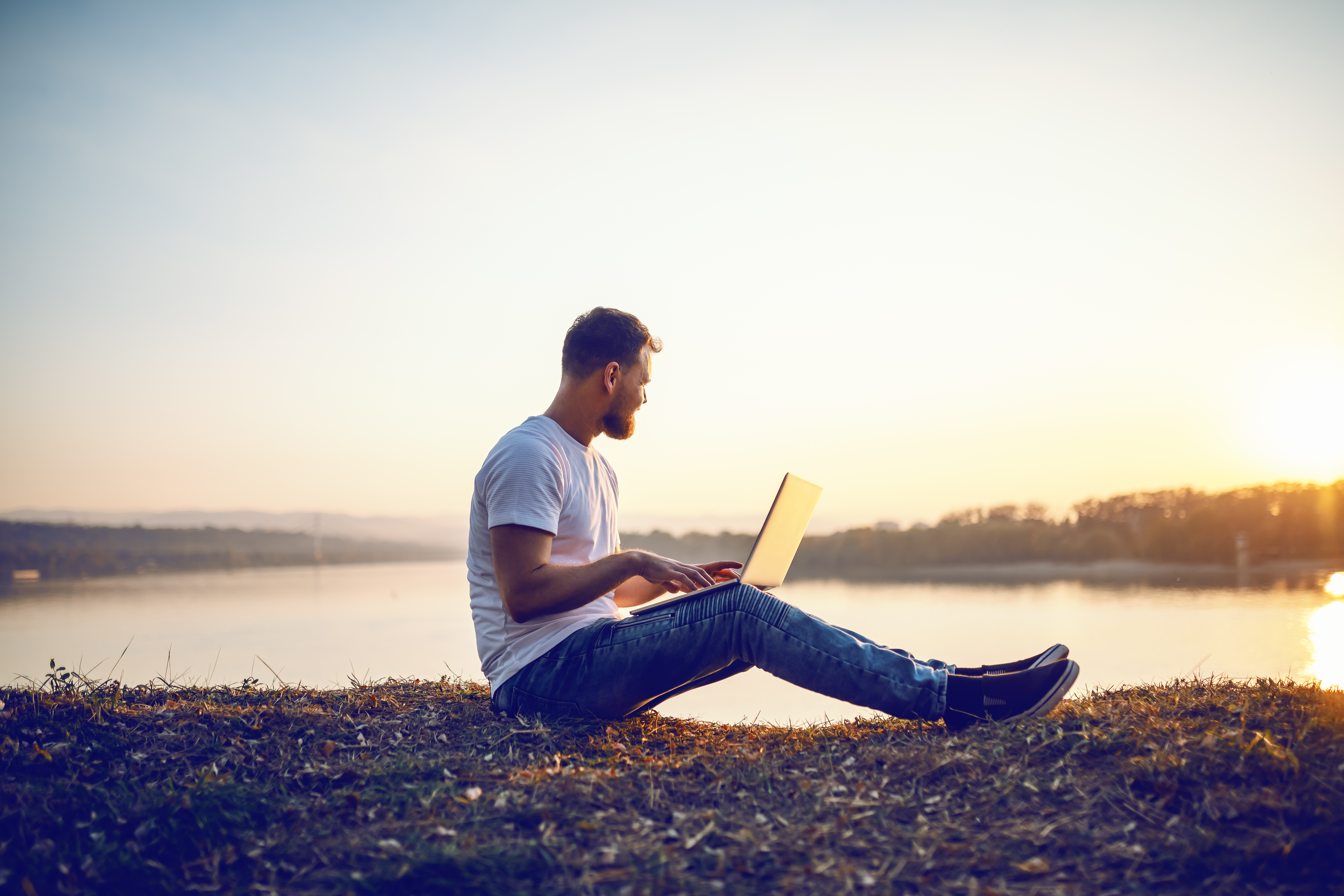 Created with images by Unclesam - "tropical beach in Mauritius, Morne Brabant " • hd3dsh - "Deck chair on the beach under palm tree summer background 3D Rendering" • Dusan Petkovic - "Side view of handsome bearded caucasian blond man sitting on cliff, looking at sunset and typing on laptop. In background is river or lake." • PAJDJW - "success businessman hold light bulb for good idea. brainstorming creative.idea innovation and inspiration concept creativity with bulbs that shine, success moment and get the best idea to pass problem"