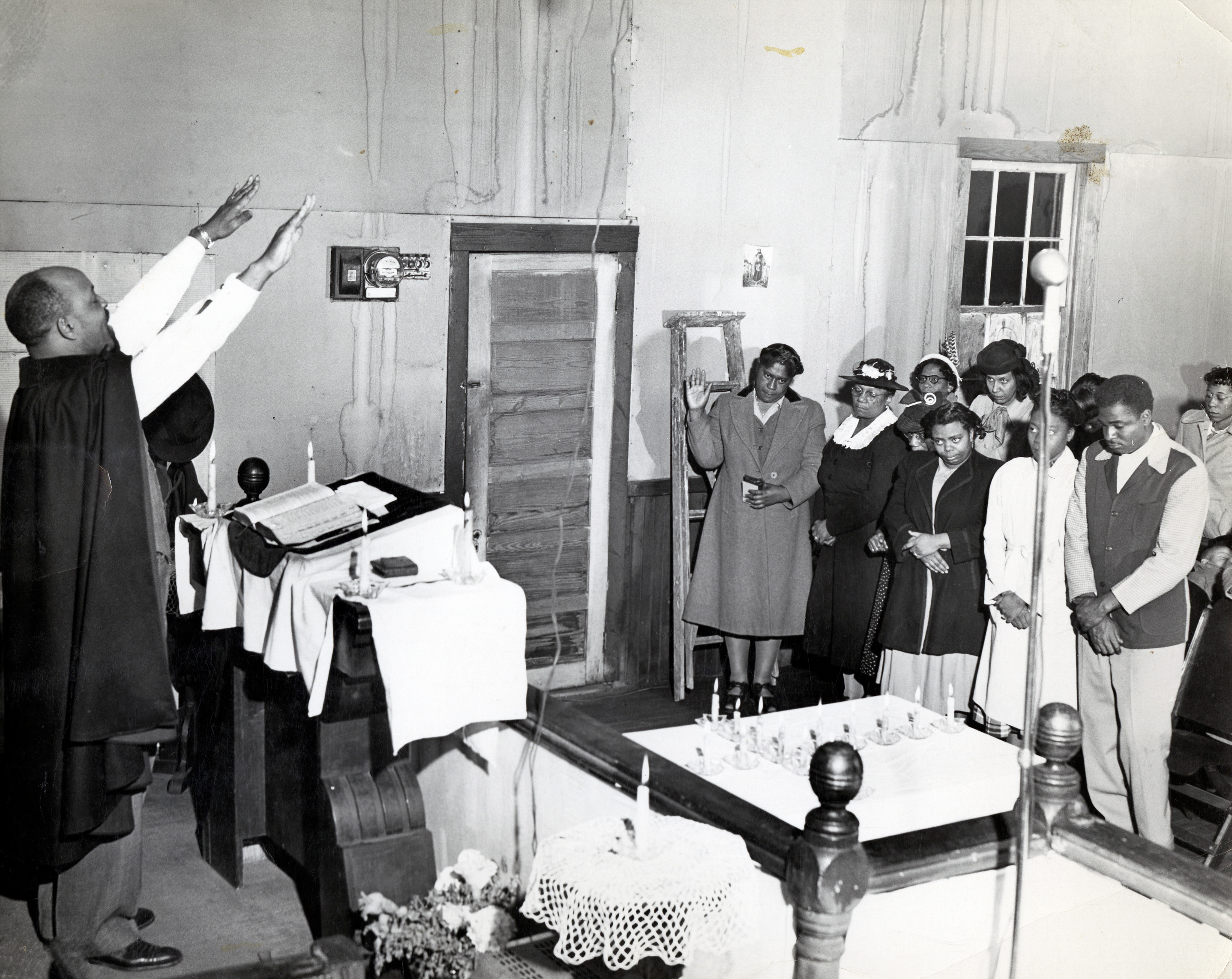 In another photo by Durant, a minister proclaims a benediction over participants in an unidentified church. The church interior appears somewhat unfinished, and a ladder propped against the wall indicates that possible construction or renovation work was in progress at the time the photo was taken. Many smaller African American churches met in modest settings yet still managed to have a dynamic impact upon their congregations. According to local historian Rex Ellis, “The black church has historically been the organizer, leader, conscience, and representative of the community.”[3]