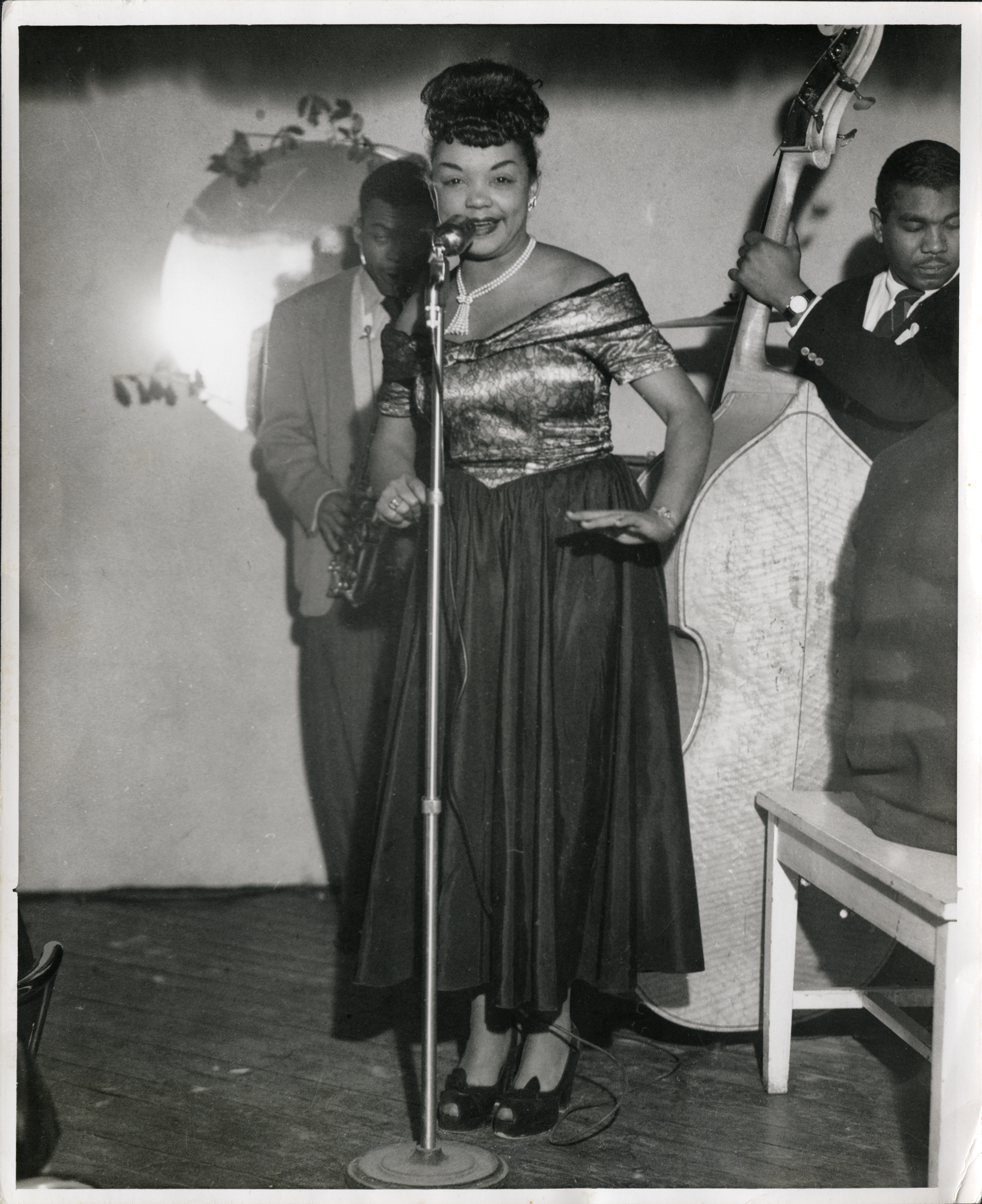 The Albert Durant Photography Collection provides a fascinating glimpse into African American social life in the Williamsburg, Virginia, area during the 1940s and 1950s. A number of segregated nightclubs existed where African Americans could gather to socialize, dance, and listen to musicians, singers, and comedians. Many African Americans, including Albert Durant, traveled to other cities to hear major jazz performers. According to Durant’s wife, Elsie, “He was a great fan of jazz and blues. He would even go to New York to meet people in the bands and take pictures of them.”[1] African Americans who loved music also organized regional productions to showcase local talent. Albert Durant carried his camera to many of these events and captured the excitement as audiences laughed at silly floor routines, swayed to jazz music, or cheered for R&B singers.