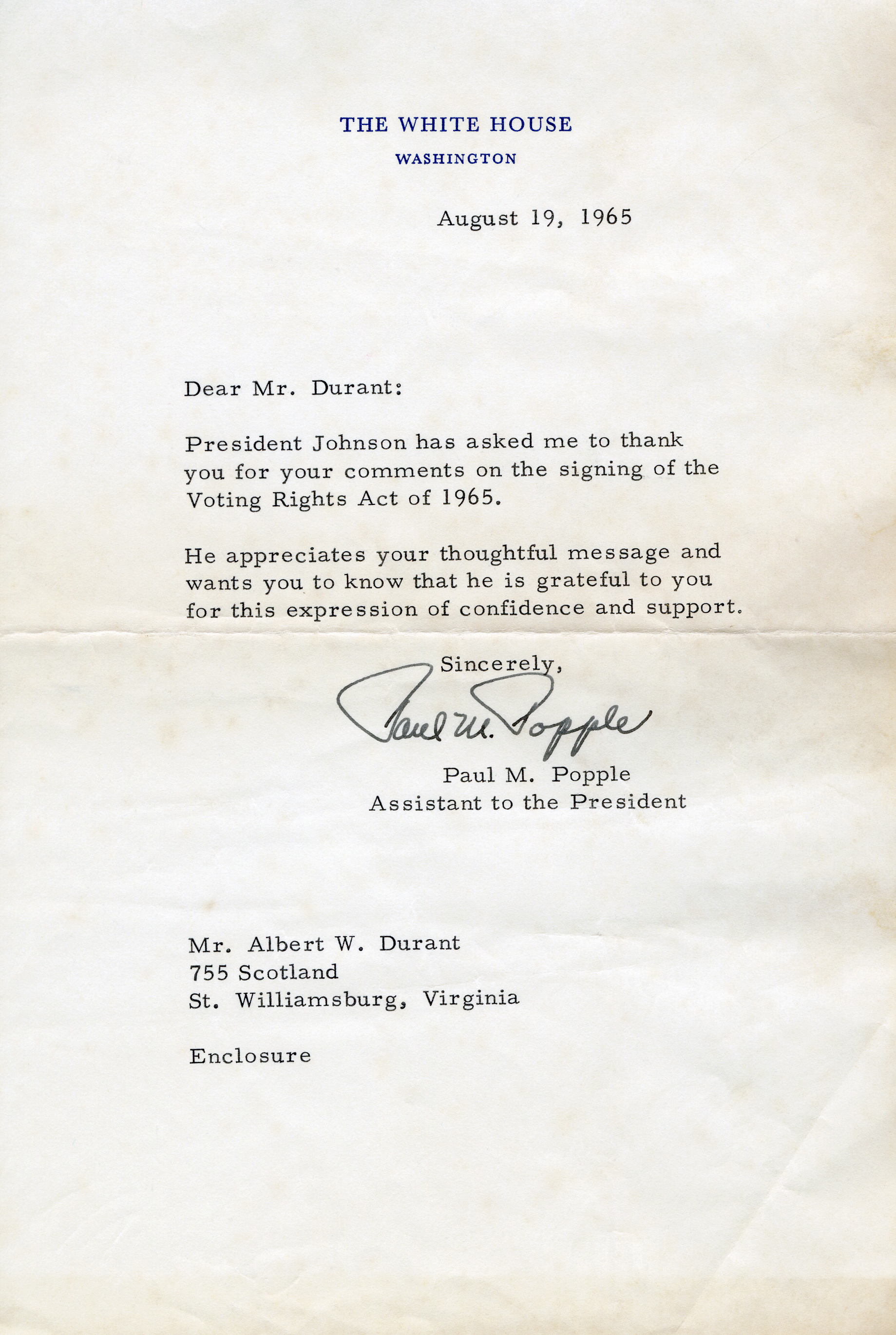 [5] Paul M. Popple, Assistant to the President of the United States, to Albert Durant, August 19, 1965, Albert Durant Photography Collection, AV1992.1, John D. Rockefeller Jr. Library, The Colonial Williamsburg Foundation, Williamsburg, Va.