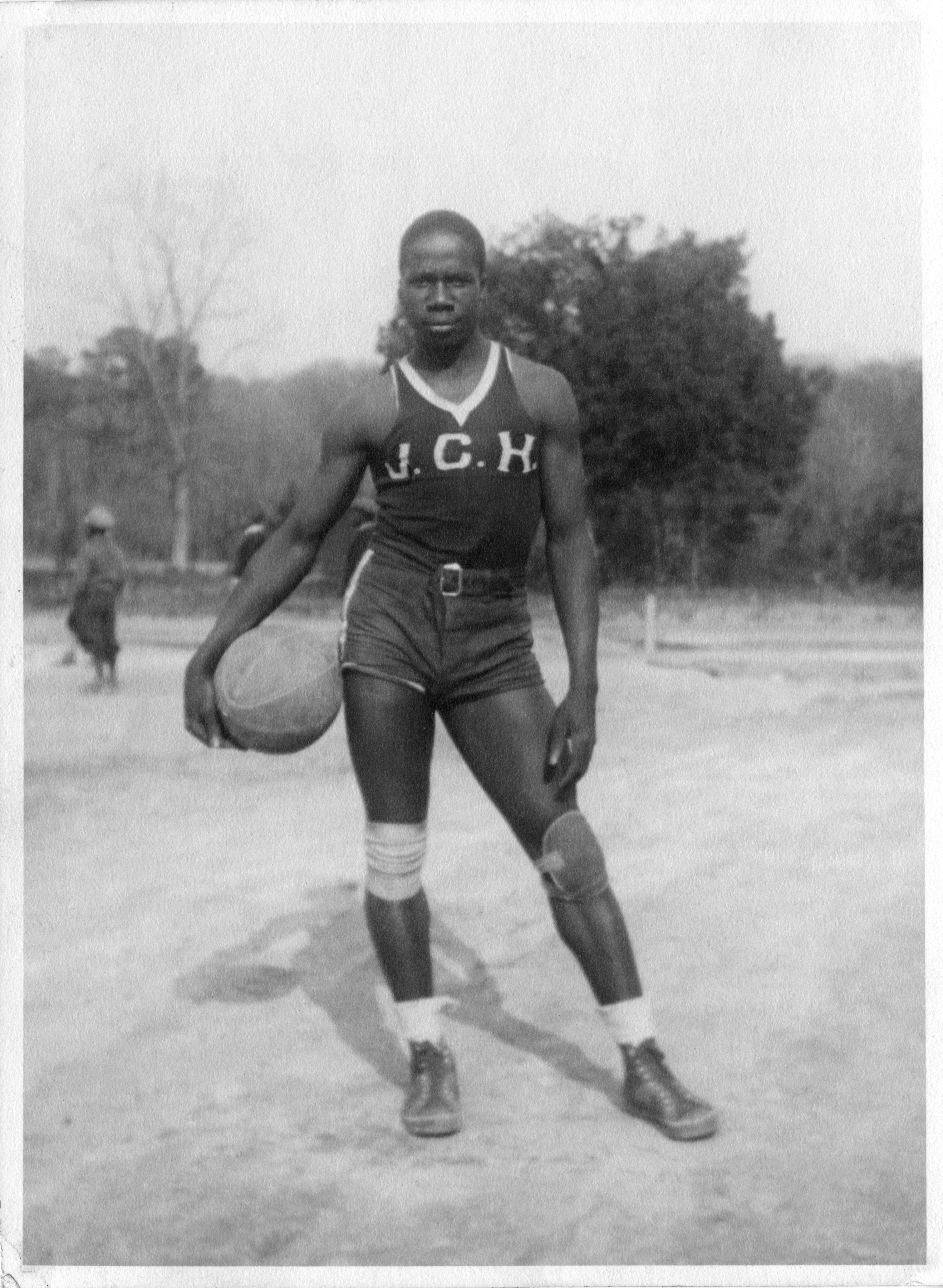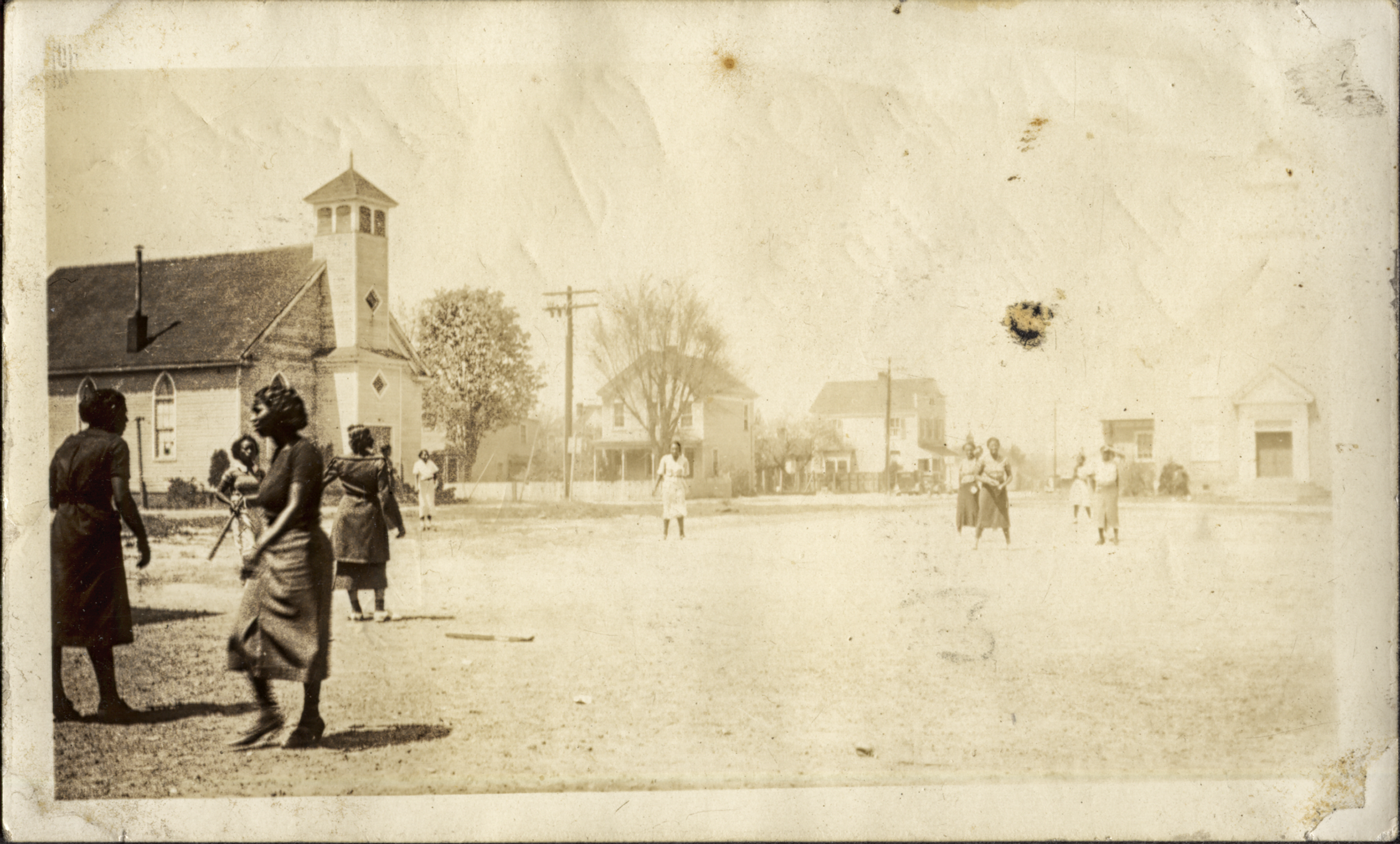 At school playgrounds and gyms, students and adults could practice softball, baseball, football, and basketball. Durant’s photos capture a wide variety of school sporting events, ranging from the Bruton Heights football players during Homecoming games to group shots of girls’ basketball teams and cheerleading squads. Two photos featured in this section show boys and girls playing baseball and softball in Potts Field adjacent to James City County Training School in the late 1930s. Both photos are interesting not only for their observance of students at play, but also for their recording of the African American neighborhood that used to stretch from the corner of Nicholson and Botetourt streets north towards the railroad tracks (see Education section). James City County Training School, Union Baptist Church, Mount Ararat Baptist Church, and a residential area are all visible in the backgrounds of the images.
