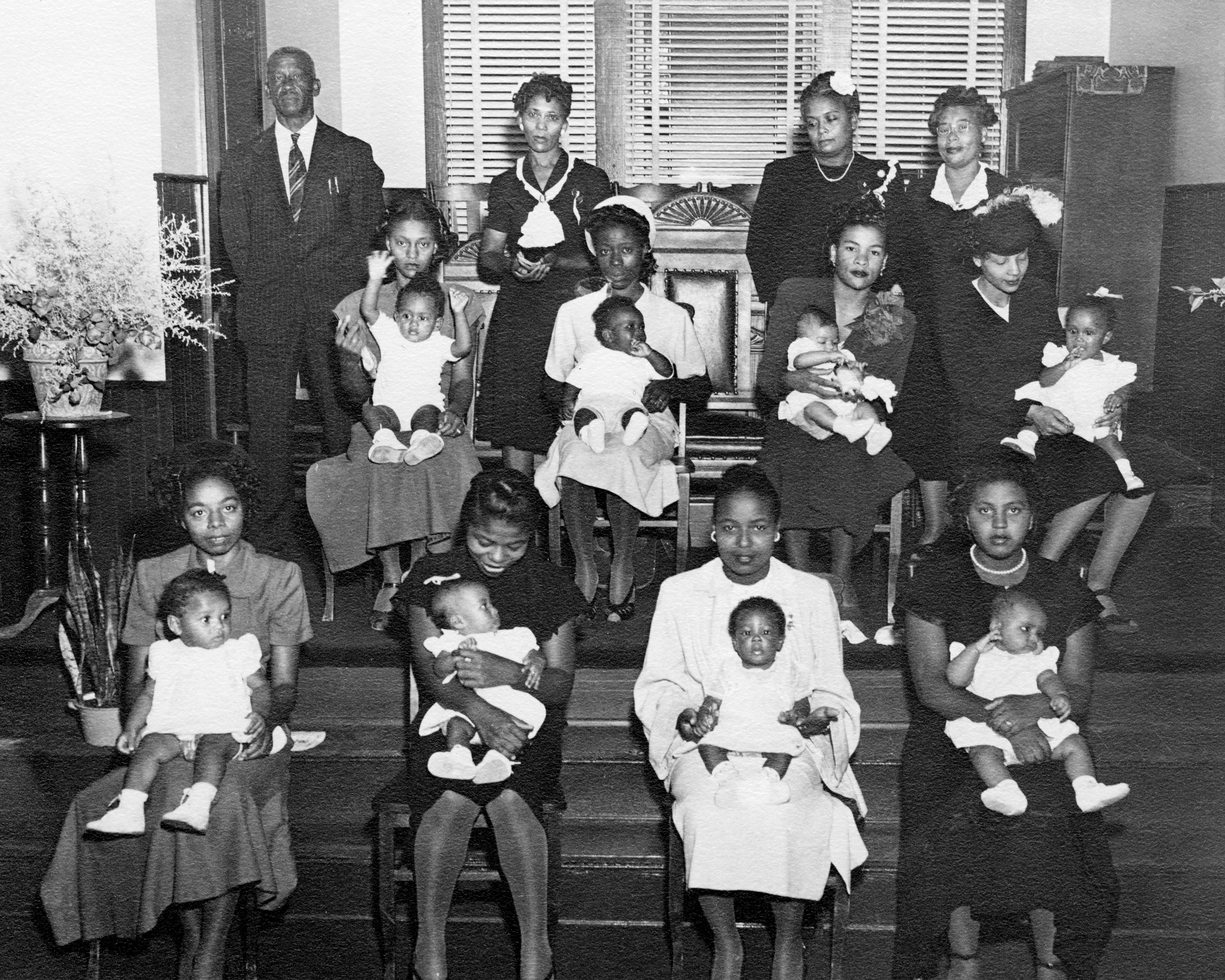 African American churches viewed their role as one that moved beyond helping worshippers to experience God’s presence and find spiritual healing. Churches sought to educate their members about government, including voting and public officeholding.[6] Church leaders' encouragement of family values gave them a broad sphere of influence in the community, too. Whether or not individuals had strong religious beliefs, they did appreciate the financial and emotional support that congregations offered. Baby contests provided mothers with an opportunity to raise money for their church’s benevolence fund and missionary projects. Young mothers signed up their babies and then competed to see who could raise the most money through bake sales, yard sales, and other activities. Whichever mother collected the most money had the honor of seeing her child named the winner of the baby contest. St. John Baptist Church in Williamsburg held such competitions regularly and asked Durant to document the participating mothers and babies in this group photo taken in 1948.