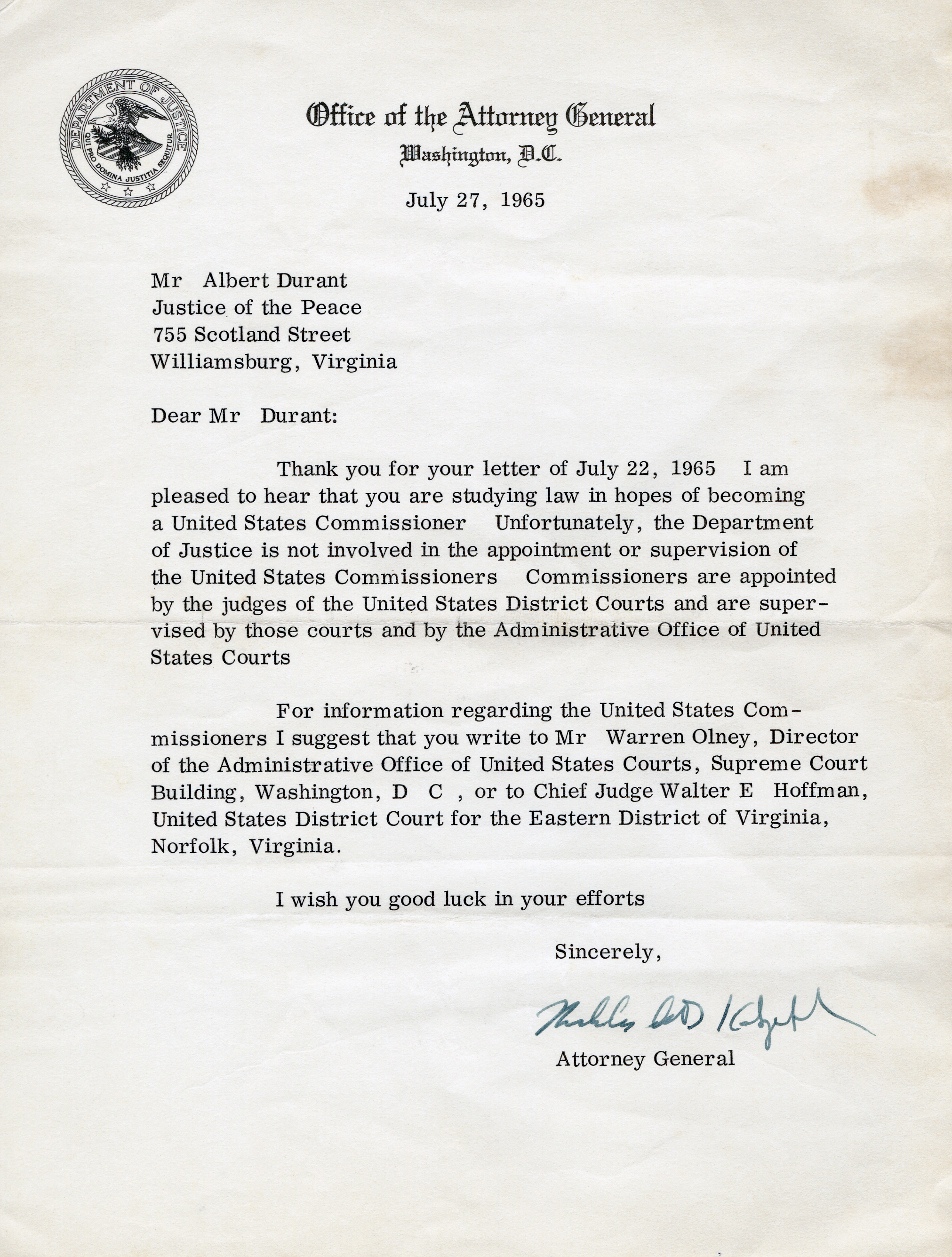 [4] Nicholas Katzenbuch, U.S. Attorney General, Washington, D.C., to Albert Durant, July 27, 1965, Albert Durant Photography Collection, AV1992.1, John D. Rockefeller Jr. Library, The Colonial Williamsburg Foundation, Williamsburg, Va.