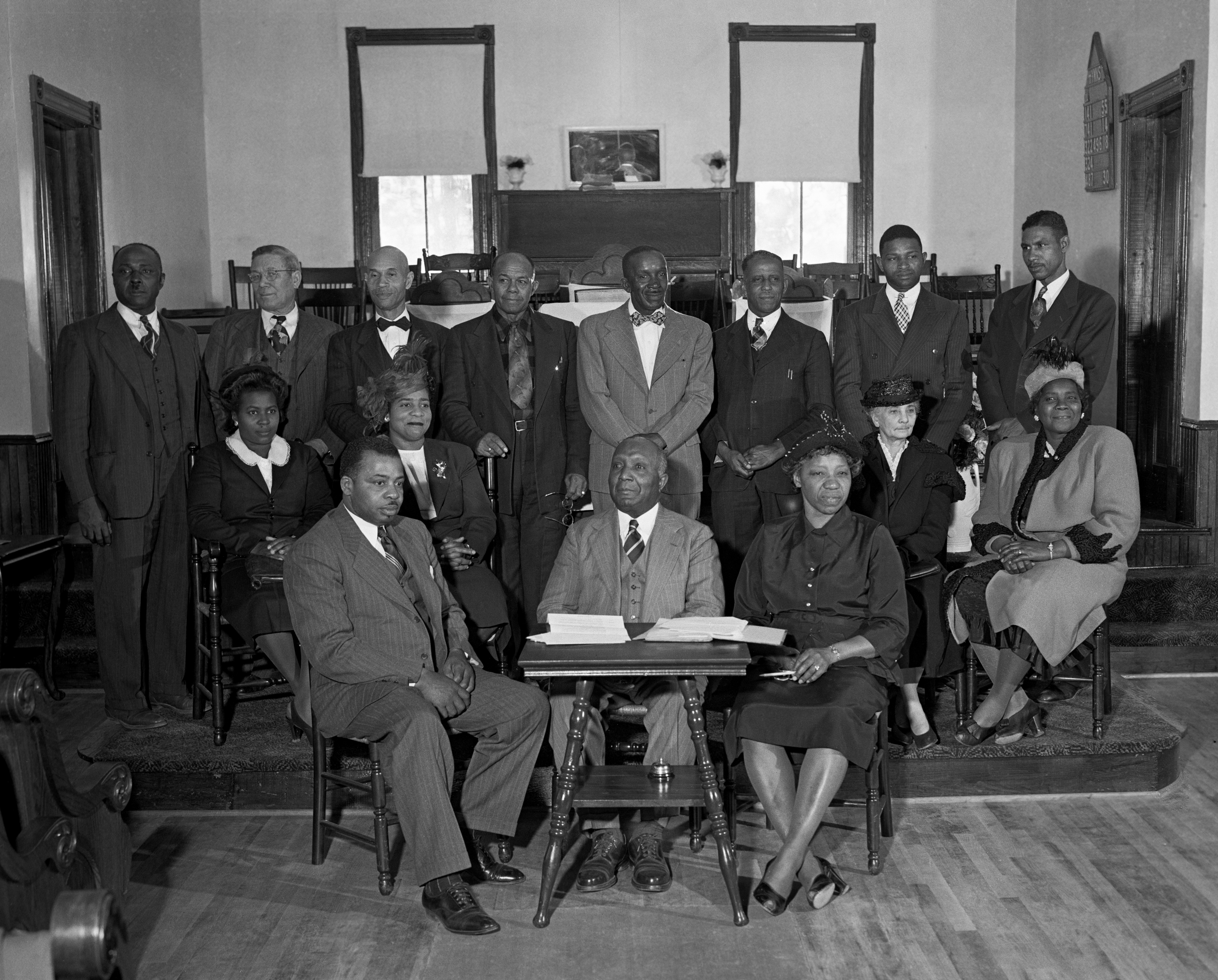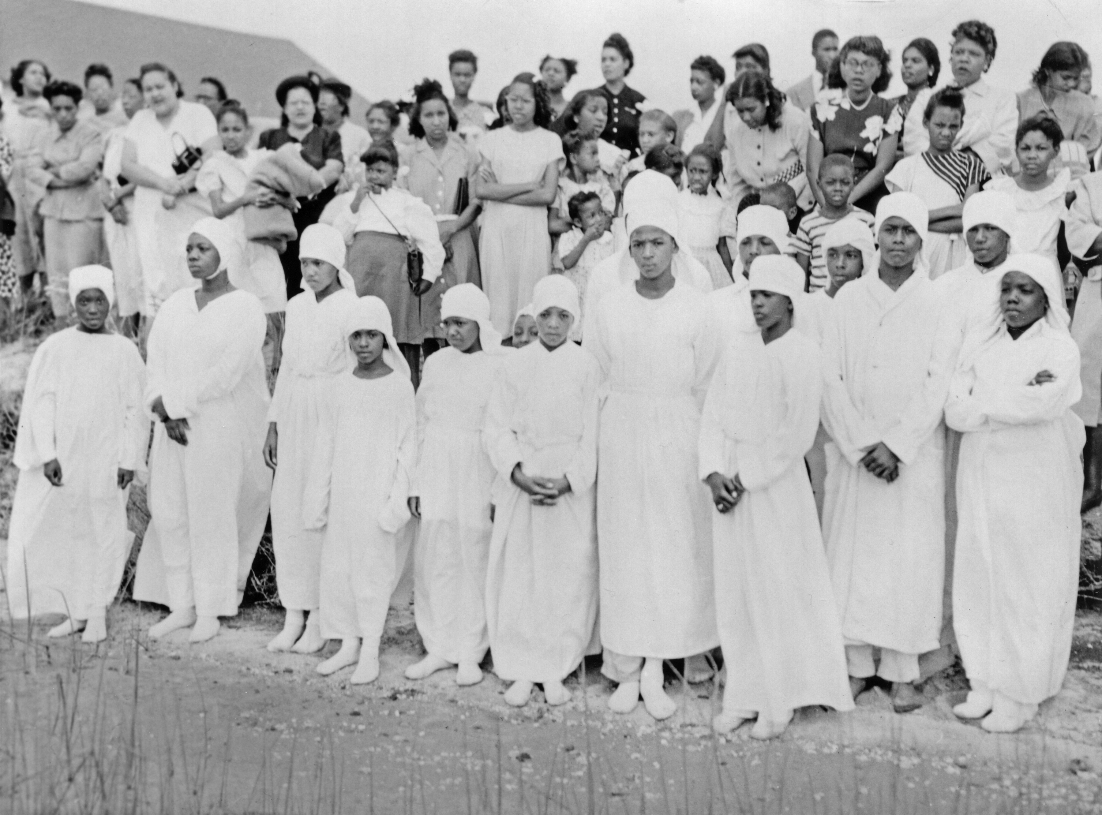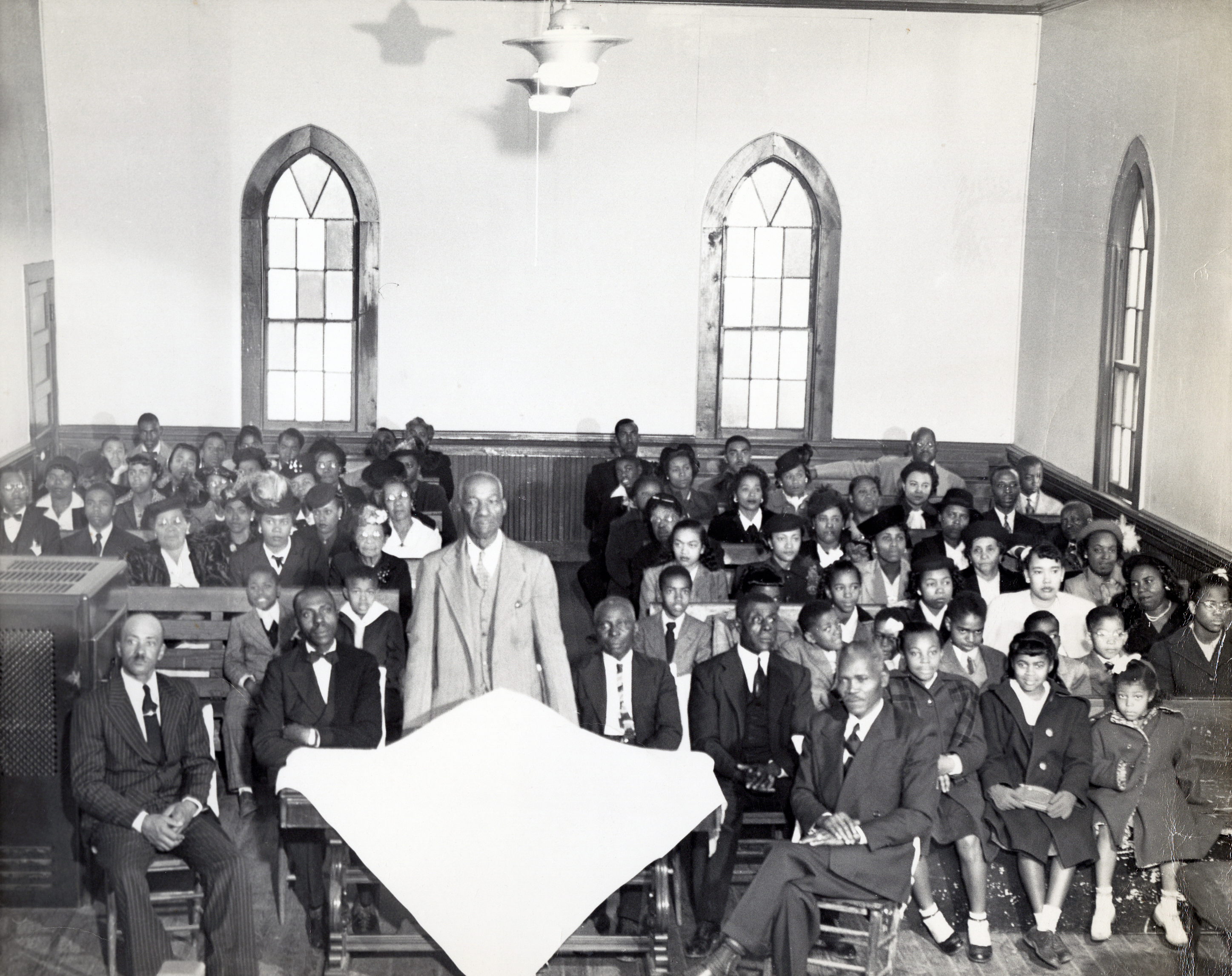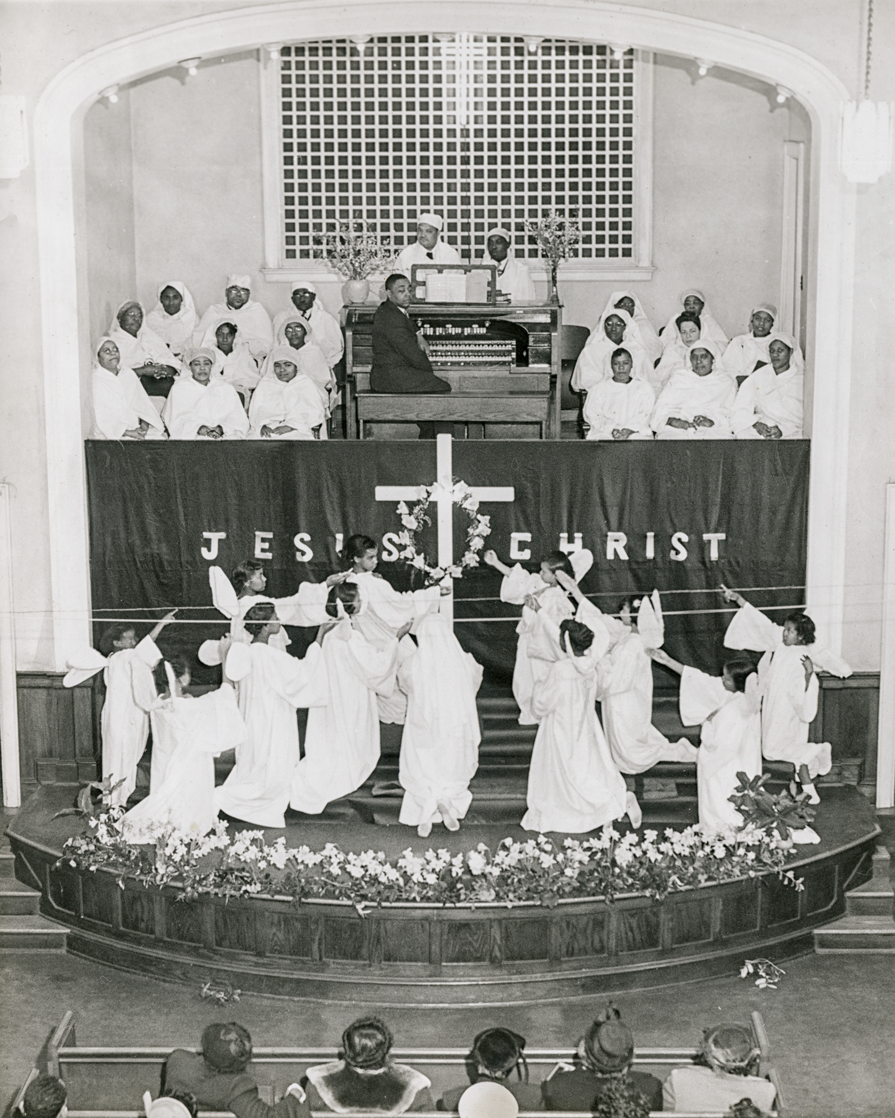 In the last photo on this page, Durant captured the pageantry of an Easter drama in the sanctuary of Mount Ararat Baptist Church in the 1950s. Girls assembled in a formation portray angels while a choir and an organist watch from above. The beautifully appointed worship space—with carved wood accents, a choir loft, and organ—contrasts with the more humble gathering depicted in the photos of Little Zion Baptist Church and the unidentified church shown above.