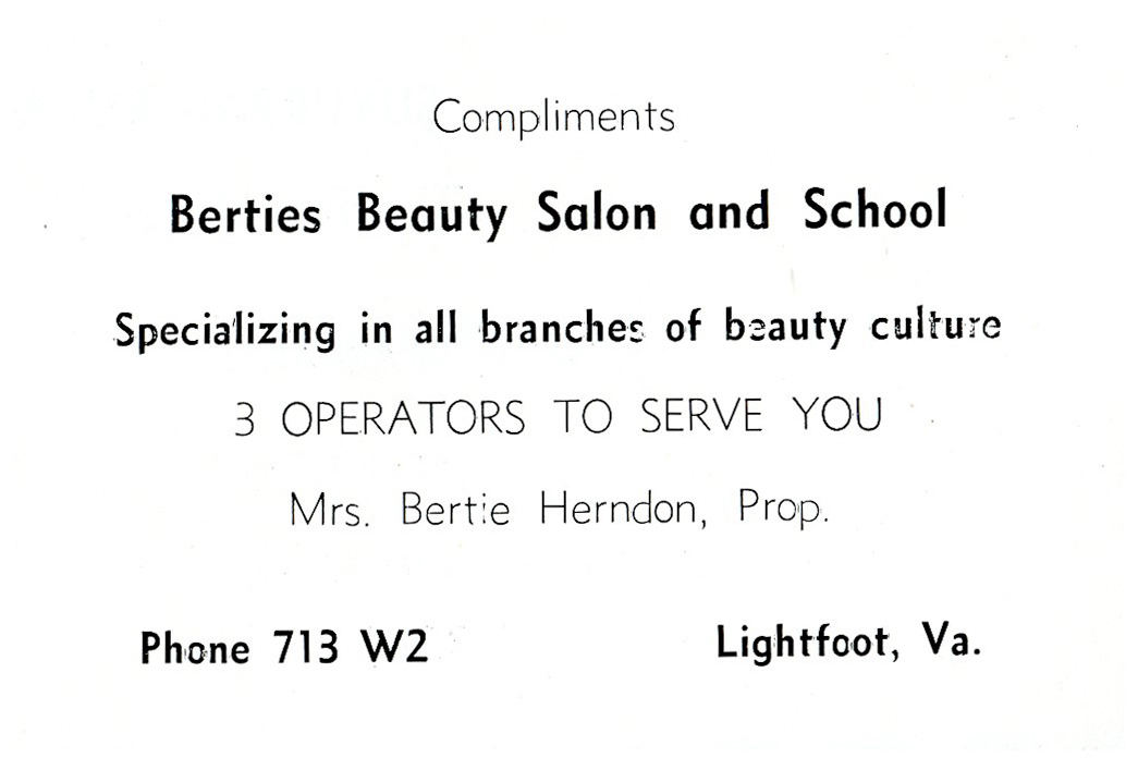 Beauty shops in the Williamsburg area gave African American women an opportunity to further their entrepreneurial spirit. Bertie’s Beauty Salon and School in Lightfoot, Virginia, owned by Bertie Herndon, supplied a wide range of hair styling services and products and trained beauticians. Ms. Herndon also held meetings of the local Beautician’s Association at her salon (see Local Organizations section).
