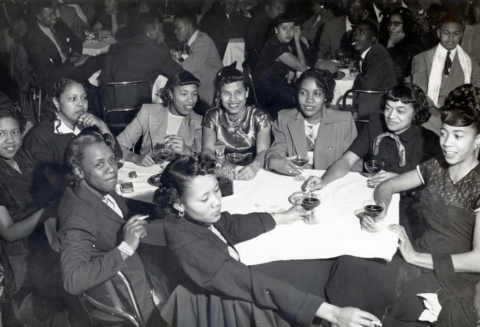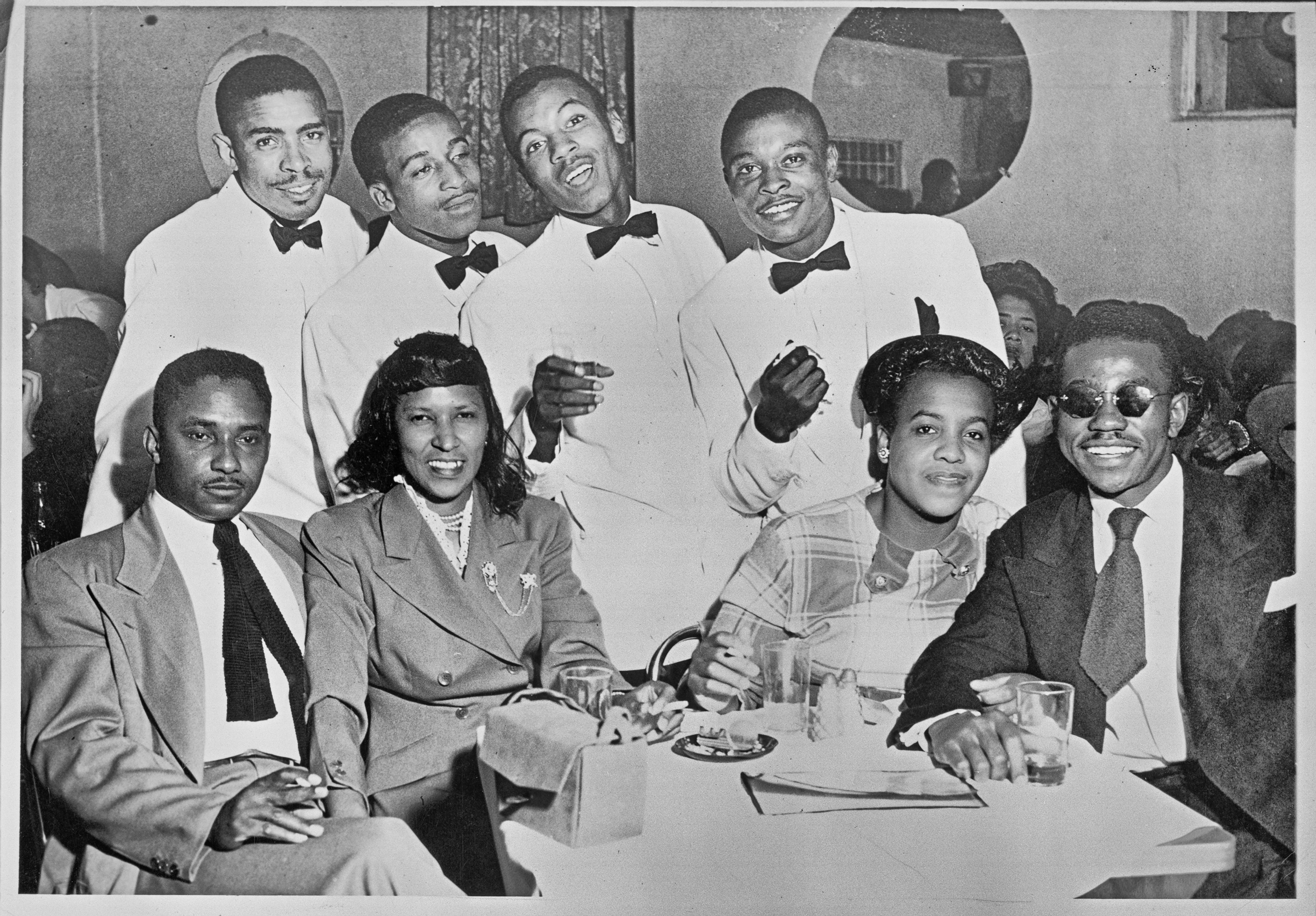 By participating in men’s singing groups, African American men with vocal skills could earn extra money and pursue a musical hobby on the side. Quartets and quintets strolled about the nightclubs to engage audiences and provide intermissions between larger acts. A number of Durant’s photos show such men’s vocal groups serenading tables of customers.