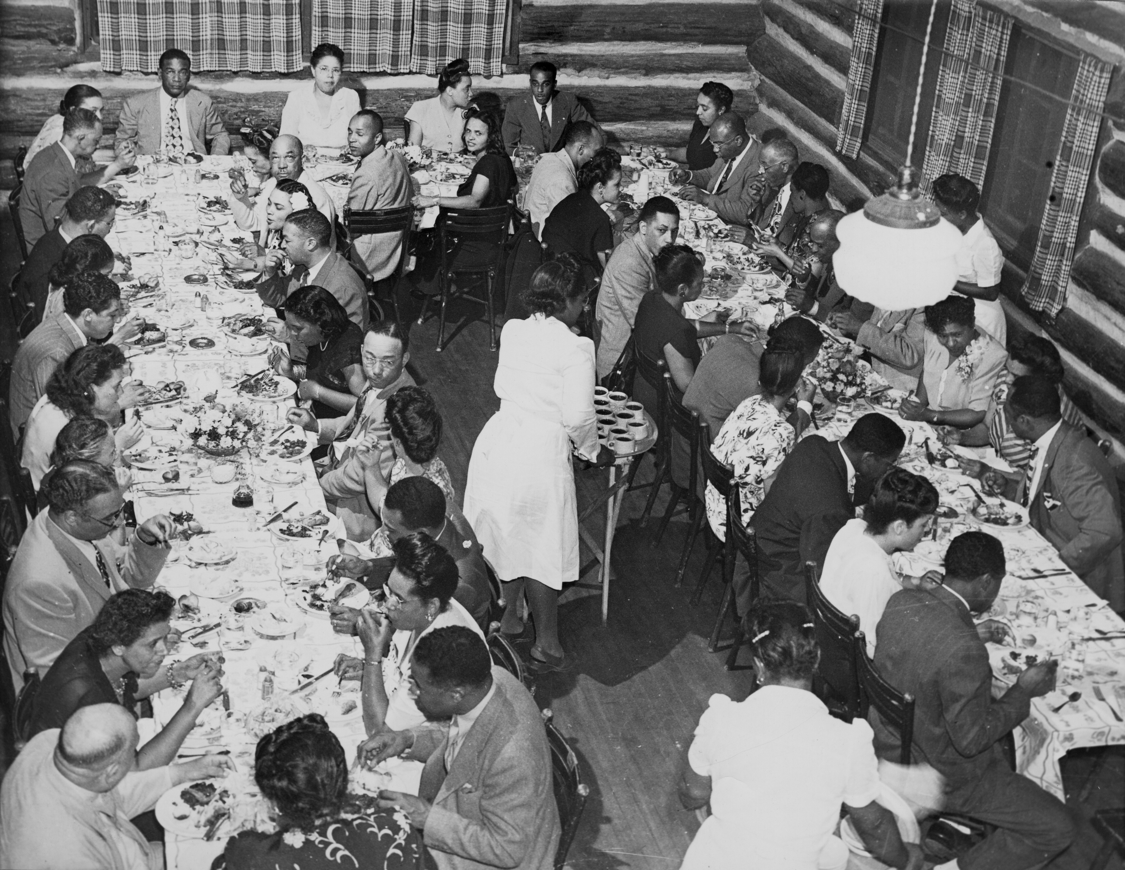 The “cabin” part of the facility, a large social hall built to resemble a log cabin, managed by Cornelius Palmer, gradually became a destination for performers on the Chitlin Circuit. Many well-known musicians, including Fats Domino, Ruth Brown, and Little Richard, gave concerts at Log Cabin Beach during the 1950s and attracted residents from many surrounding communities. Local African American community and church groups also made use of the cabin for dinners and meetings, as documented in some of Durant’s photos of the fellowship hall.