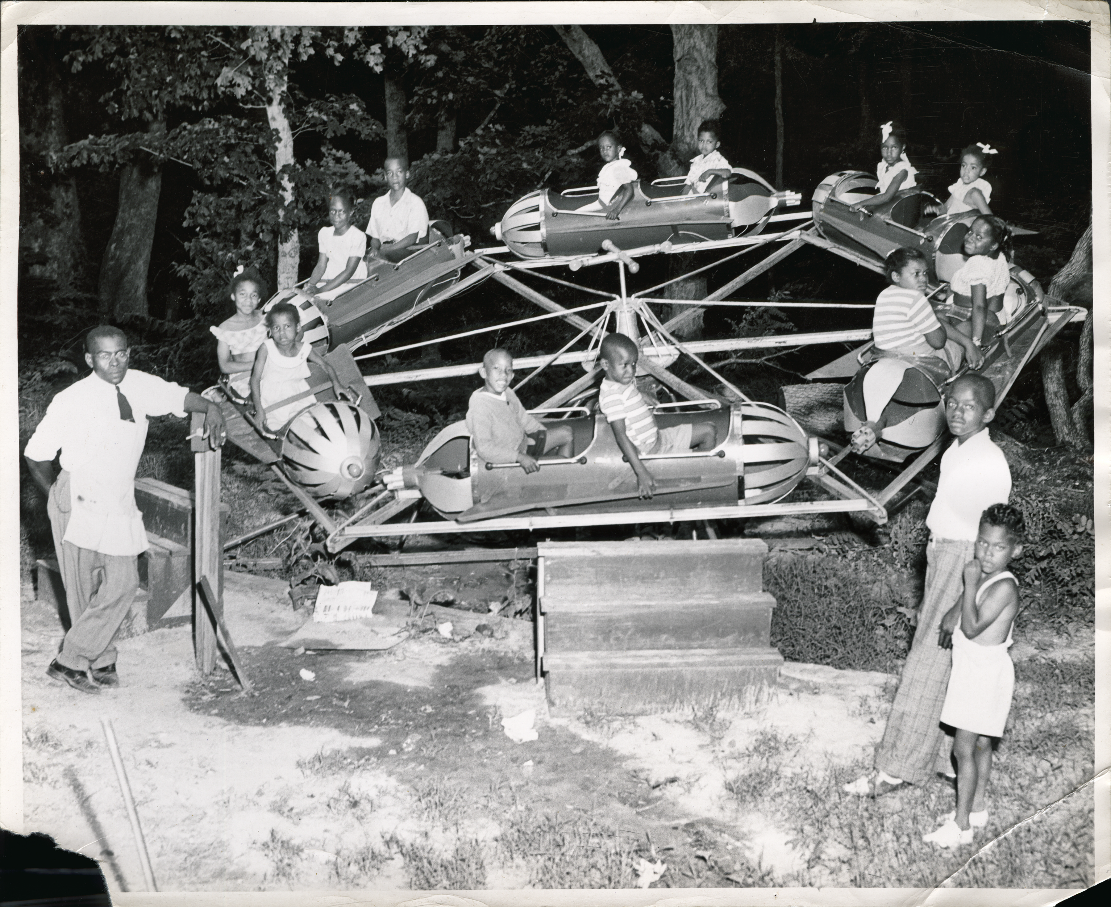Temporary amusement parks offered another recreational outlet for African Americans in the Williamsburg area. Local organizations, such as the Jaycees, held annual fairs or “jamborees” that families could attend. Several of Durant’s photos show children enjoying amusement park rides at such an event. While the exact location of the jamborees is not known, Williamsburg residents recall a recreational area adjacent to the Gospel Spreading Church Farm, located near Jamestown along the Colonial Parkway.[1]