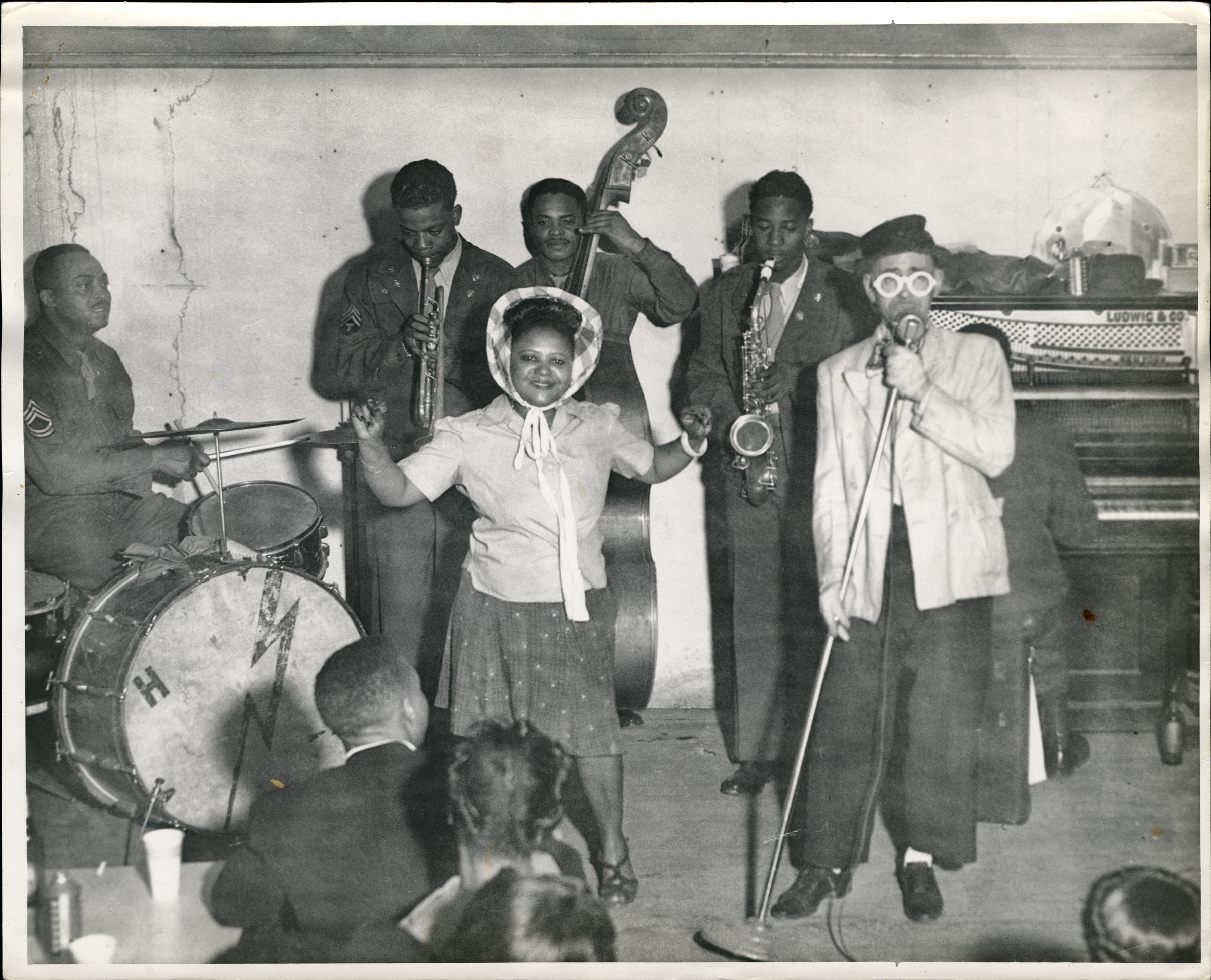 The venues frequented by Albert Durant’s camera reflect the places popular with local African American residents, including military servicemen (as shown in the photo of the comedy team). Music, dance, and comedy, as well as a night on the town at a popular floor show, played a significant role in bringing the community together. Those who toiled as laborers during the week could shed their work identities to become vibrant entertainers. The release offered by an entertaining evening gave African Americans a sense of renewal and pride.