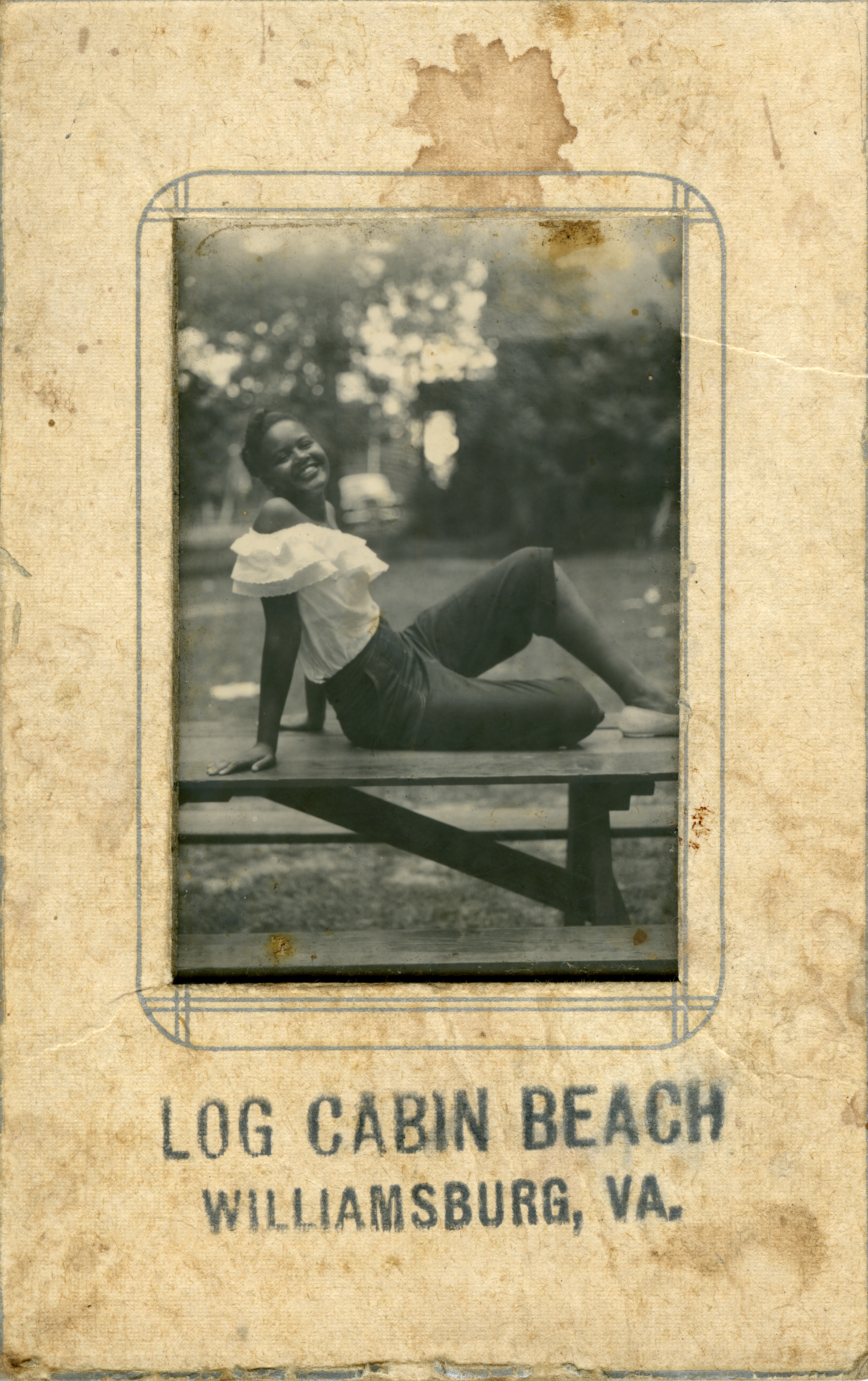 Log Cabin Beach, once located on the James River at the end of what is today known as Ron Springs Road in Grove, served as a segregated swimming beach and recreational area for African Americans in the Williamsburg area. A pleasant beach area with picnic tables and shade trees offered a place to swim, picnic, and socialize during the summer months. Albert Durant regularly took souvenir photos of family members as mementoes of their visit, and these capture the light-hearted moments spent lazing away an afternoon along the James River.