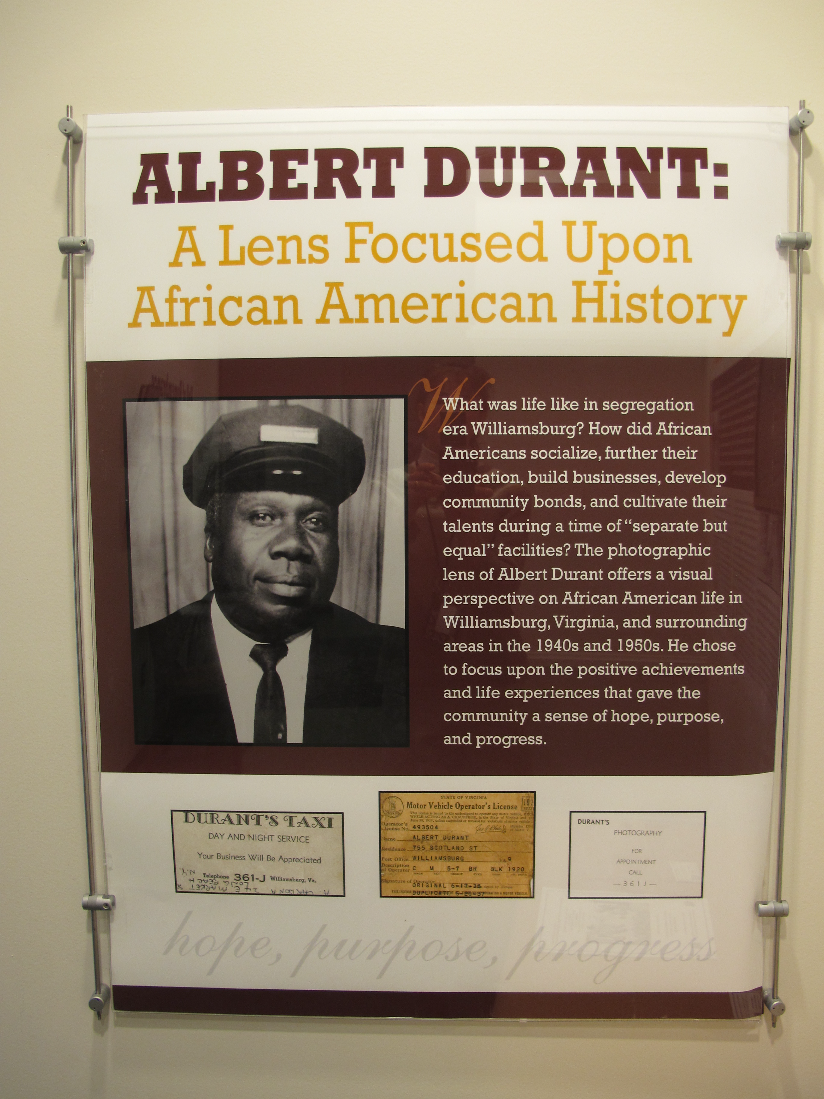 While it is not known how he received his training as a photographer, community residents speculate that it may have been via classes he audited at the College of William & Mary, where he frequently sat in to further his knowledge. As an adult, Albert Durant ran a chauffeuring and limousine service as his principal source of income. He became well known as a sought-after guide to the historic sites of the area for distinguished visitors to the city. Famous individuals he chauffeured included Her Majesty Queen Elizabeth, The Queen Mother of the United Kingdom, Prince Akihito of Japan, and various United States government officials. Durant soon found that he could at times combine his photography skills with his chauffeuring by offering to take a portrait of his clients at a historic site. He also began frequenting many African American events to offer his services as a photographer. Eventually, he became the first licensed African American photographer in the Williamsburg area.[2]