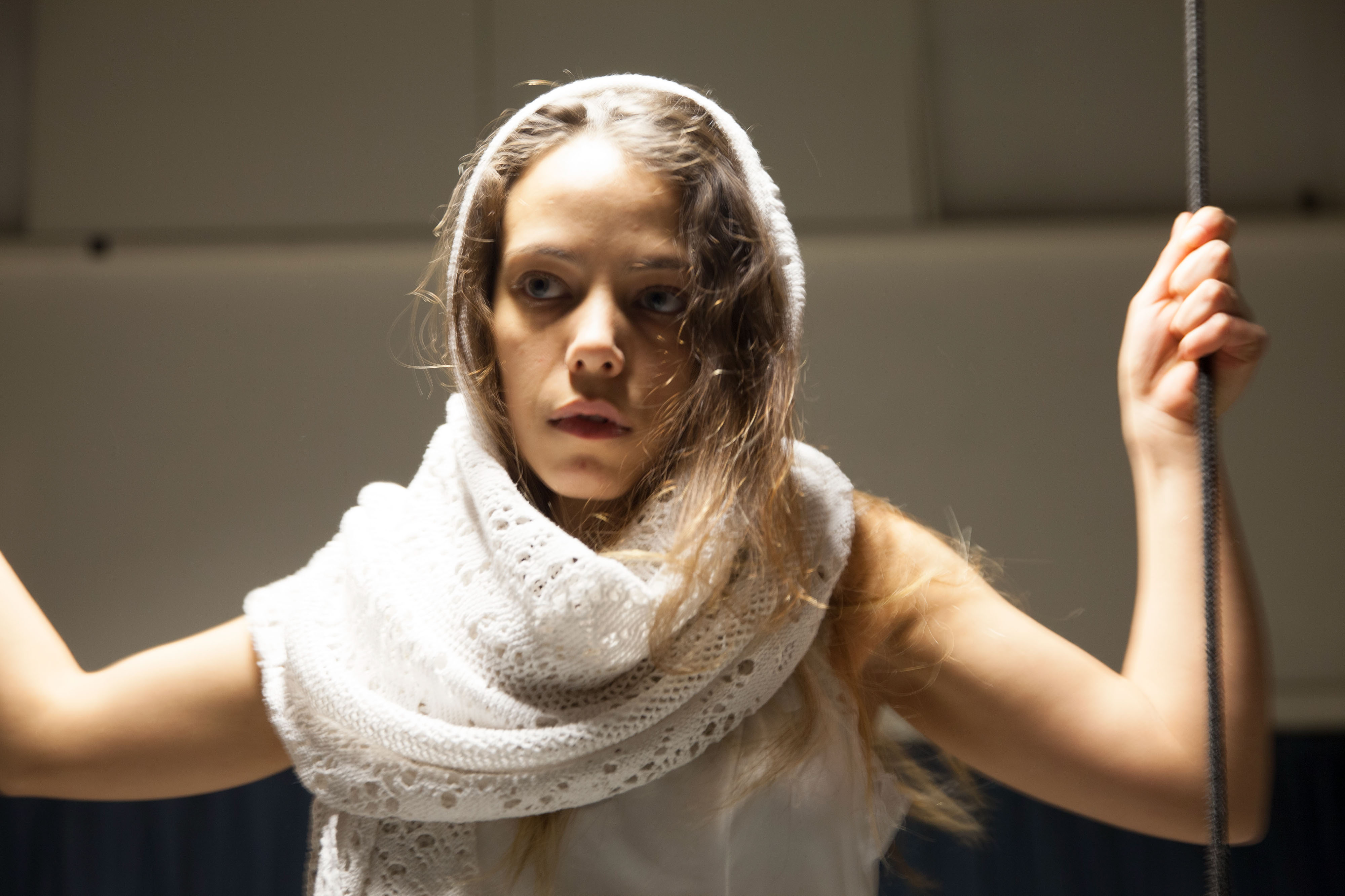 A woman sitting on the trapeze waiting for her husband who went to war. The boredom of the endless waiting for the man to be returning home. The young wife tries to approximate the sense of loss and loneliness experienced by women in a state of war and fear of the next unknown. The soldier returns home covered in blood, the wife does not know him because of the absence of his features behind the harsh mask of war, but she did distinguished him in the end. The wife embraces her husband with eagerly for his painful appearance and this hug stains her dress with blood as well, then helps him to sit on the trapeze and begins to clean his body from the effects of the war in a ritual way as if she purifying him of those effects that are certainly outstanding in the spirit and the body.