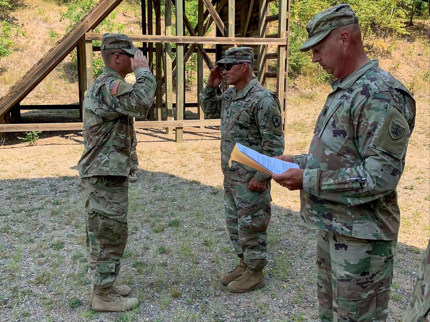 Sergeant Justin Philips, 817th Engineer Company (Sapper), left, salutes Command Sgt. Maj. Jason Magnuson, Command Sgt. Maj. Jason Magnuson, command sergeant major, 141st Maneuver Enhancement Brigade, after receiving the "Super Sapper" award, at Camp Ripley, Minnesota, August 17, 2021. Command Sgt. Maj. Scott Obridgewitch, command sergeant major, 164th Engineer Battalion, reads the citation. (Courtesy photos)