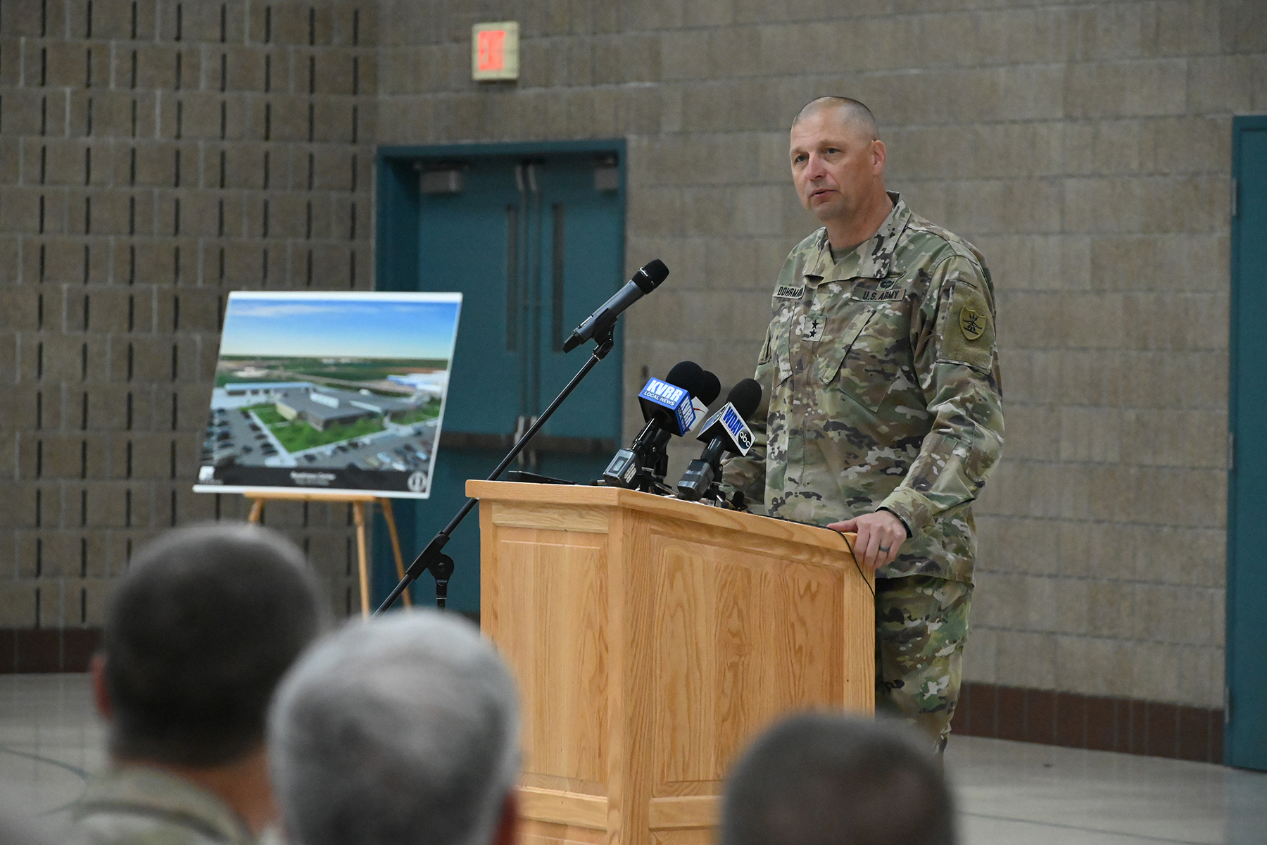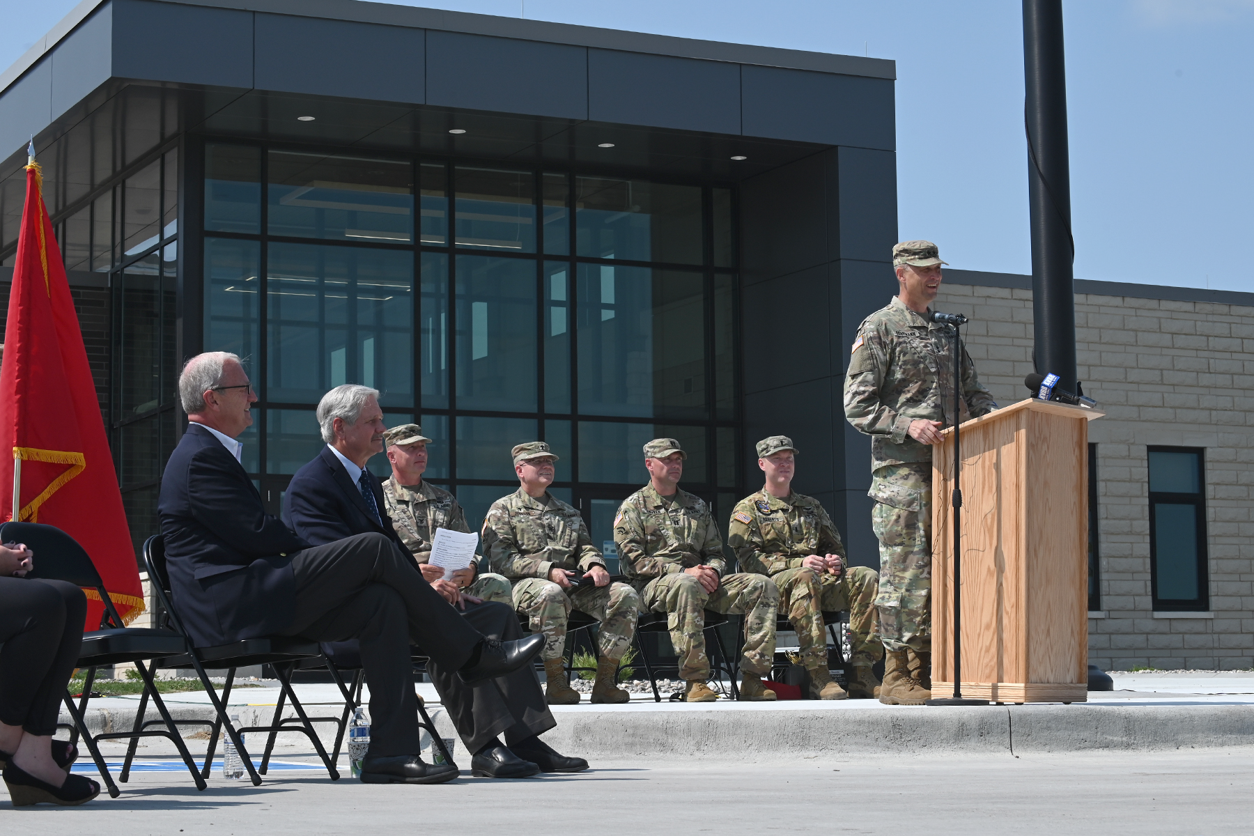 Major General Al Dohrmann, adjutant general for the N.D. National Guard, discusses the features of the Fargo Readiness Center during its dedication, Fargo, N.D., August 24, 2021.