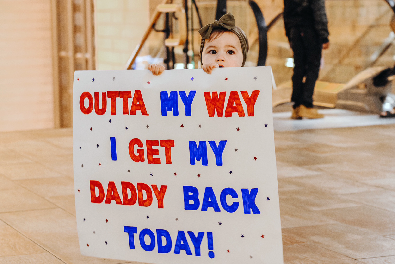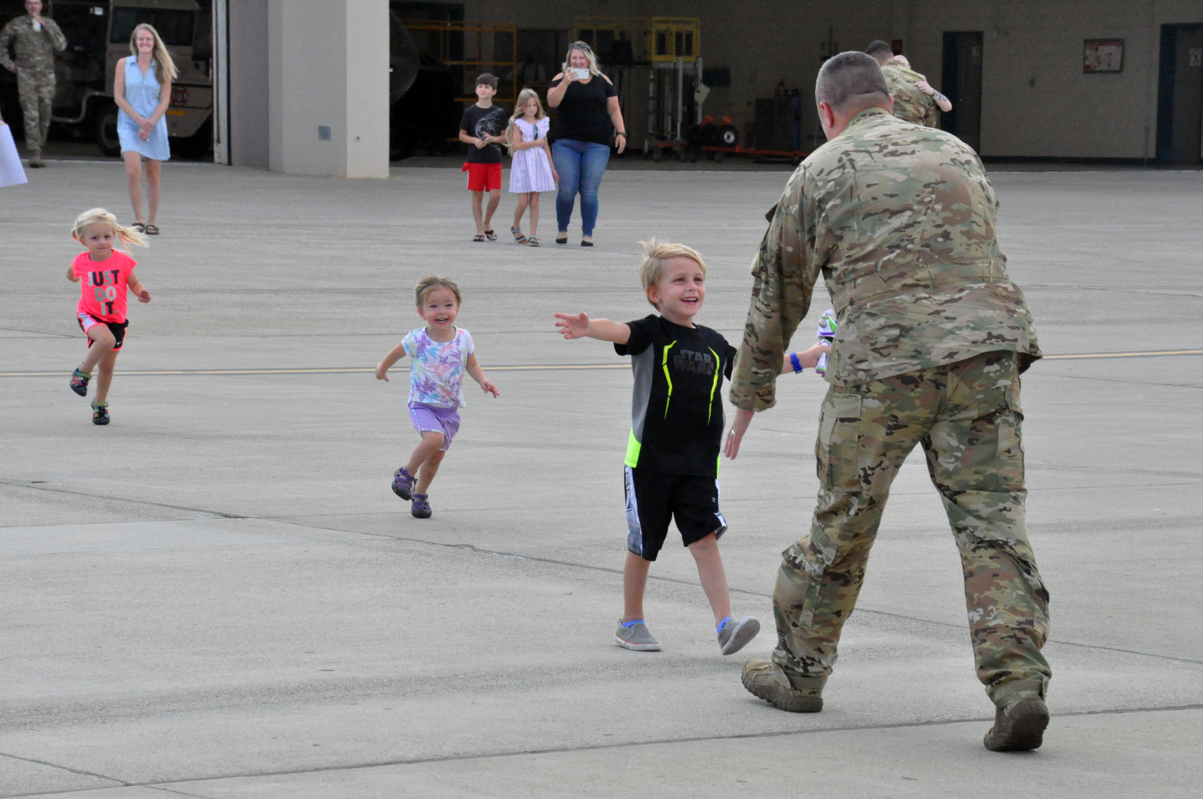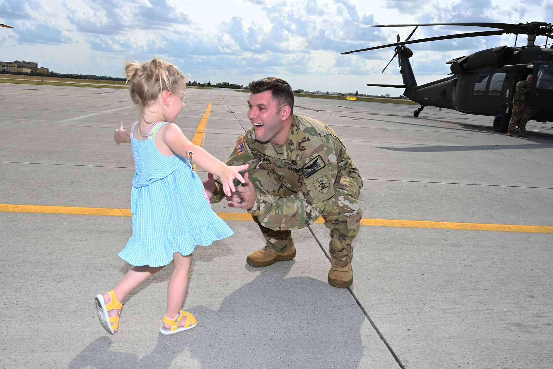 Chief Warrant Officer 2 Kyle Hoffman, Company C, 2nd Battalion, 285th Aviation Regiment, is greeted by his daughter at the Fargo Army Aviation Support Facility #2, Fargo, August 19, 2021. (National Guard photo by Chief Master Sgt. David Lipp, 119th Wing)