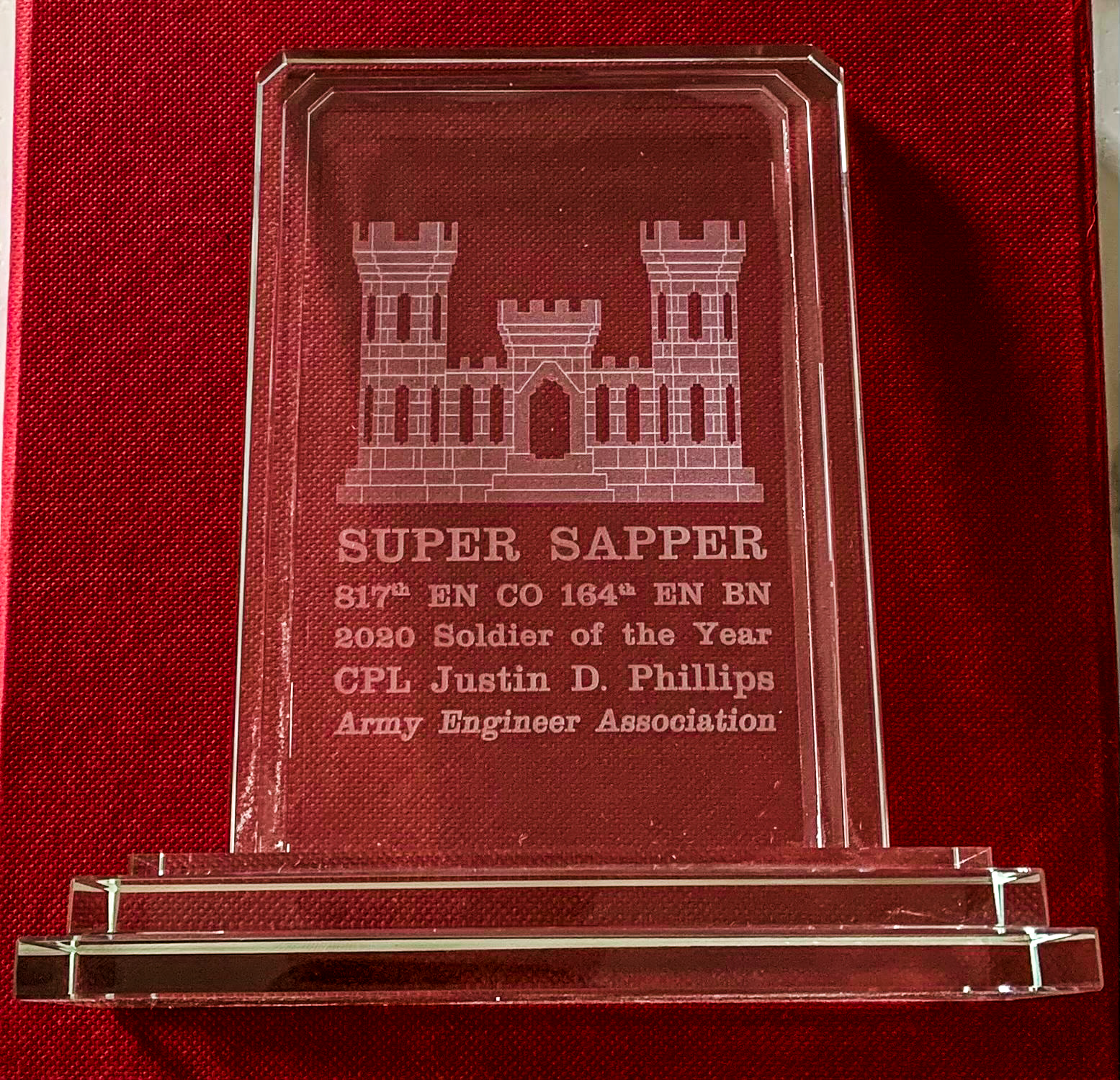 Sergeant Justin Philips, 817th Engineer Company (Sapper), received the "Super Sapper" award during the unit's annual training at Camp Ripley, Minnesota, August 17, 2021. This Army Engineer Association award is presented to Soldiers recognized by their leadership as an outstanding engineer and leader. The award was presented by Command Sgt. Maj. Jason Magnuson, command sergeant major, 141st Maneuver Enhancement Brigade. (National Guard story by Command Sgt. Maj. Scott Obridgewitch, command sergeant major, 164th Engineer Battalion)