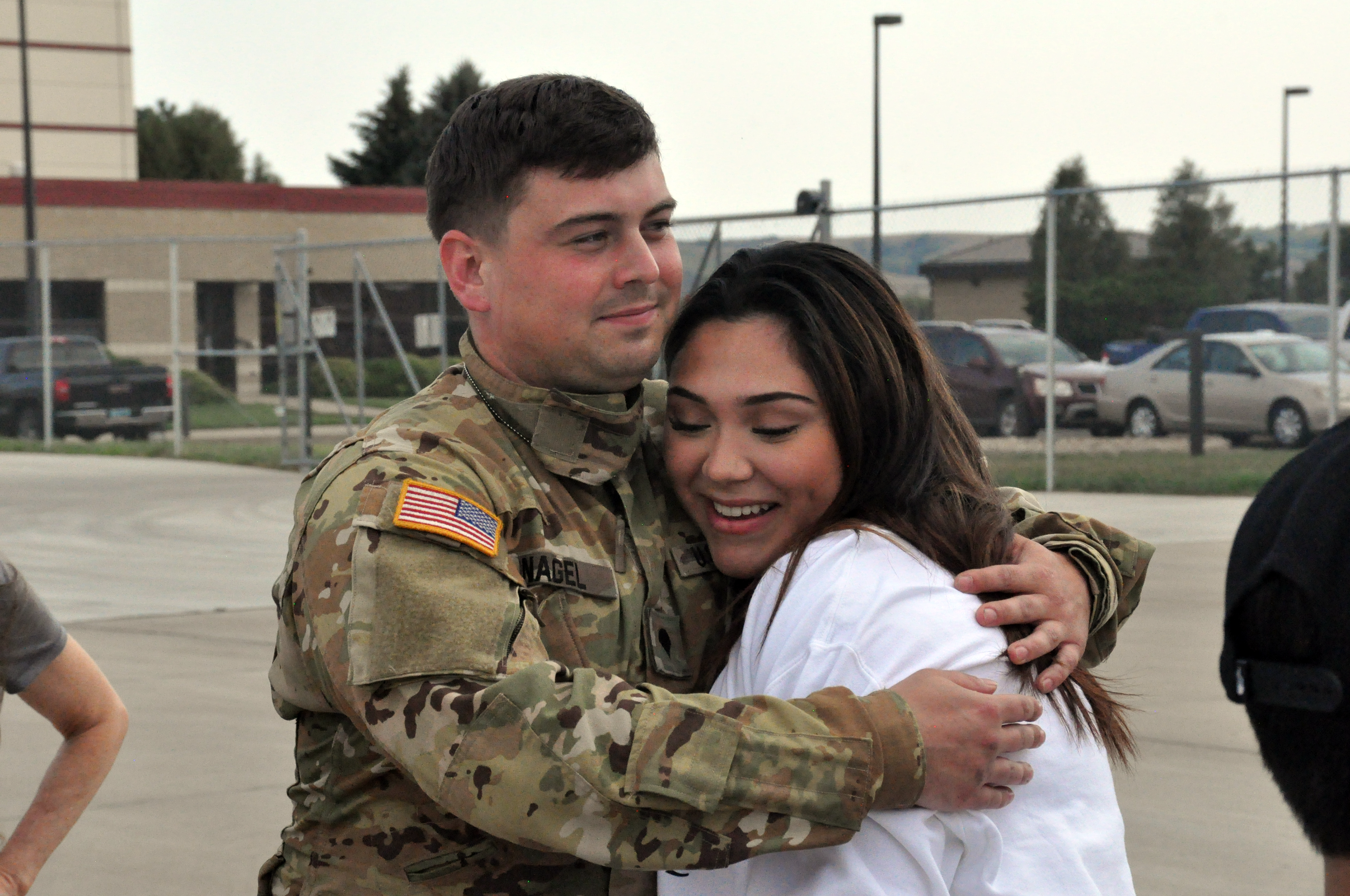 Specialist MacKenzie Nagel, Company C, 2nd Battalion, 285th Aviation Regiment, is greeted by Spc. Bianca Abrego, at the N.D. National Guard's Army Aviation Support Facility, Bismarck, August 19, 2021. Abrego, also a member of this aviation unit, returned last week from this mission to the National Capital Region. (National Guard photo by Bill Prokopyk, N.D. National Guard Public Affairs Office)