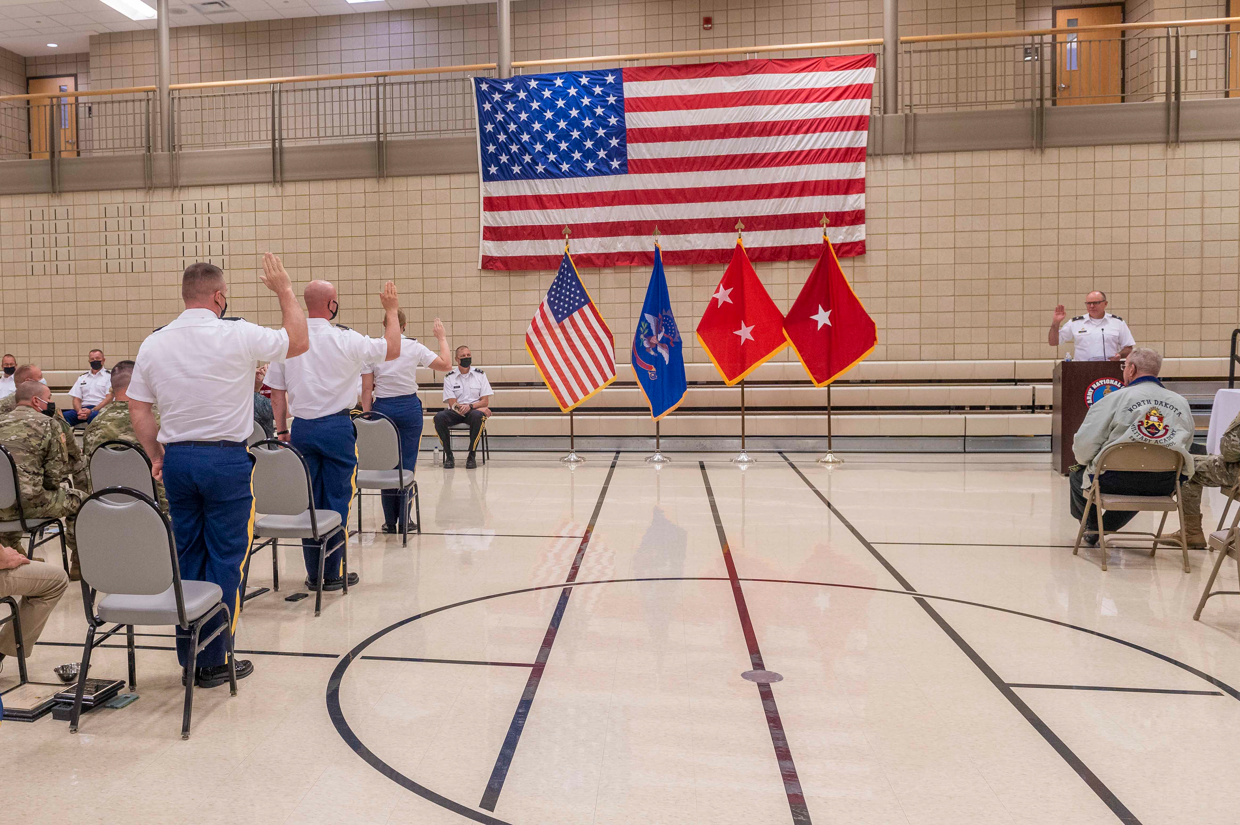 Brigadier General Leo Ryan, N.D. National Guard Army commander, administers the oath of office during the Officer Candidate School class 64 graduation ceremony, Camp Grafton Training Center, August 21, 2021. From rear to front, David Moll, Jonathan Kranz, and Rachel Church recited the oath of office, accepting their commissions as second lieutenants in the N.D. Army National Guard.