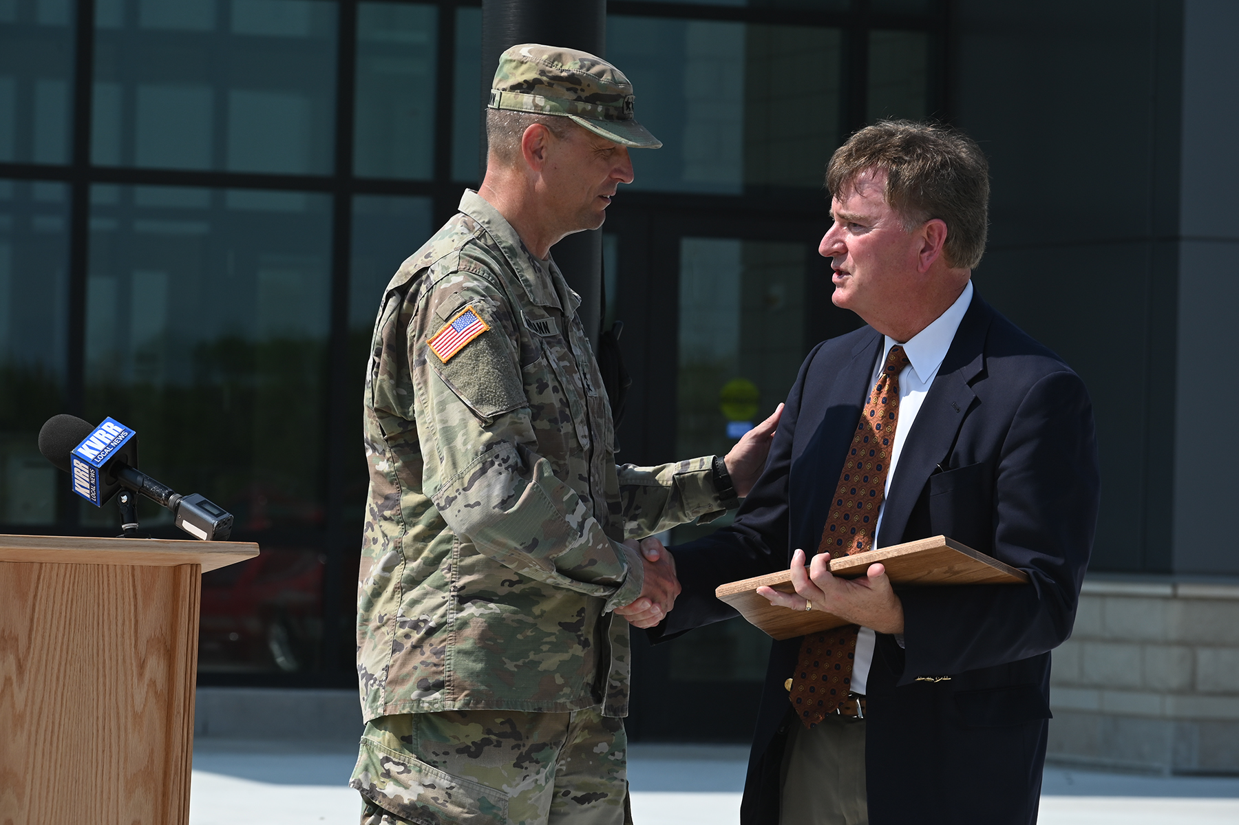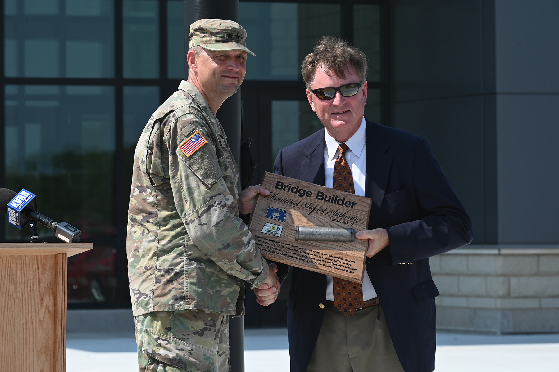 Major General Al Dohrmann, adjutant general for the N.D. National Guard, presents the N.D. National Guard's Bridge Builder award to Fargo's Municipal Airport Authority, August 24, 2021. Accepting on behalf of the organization is the executive director, Shawn Dobberstein.
