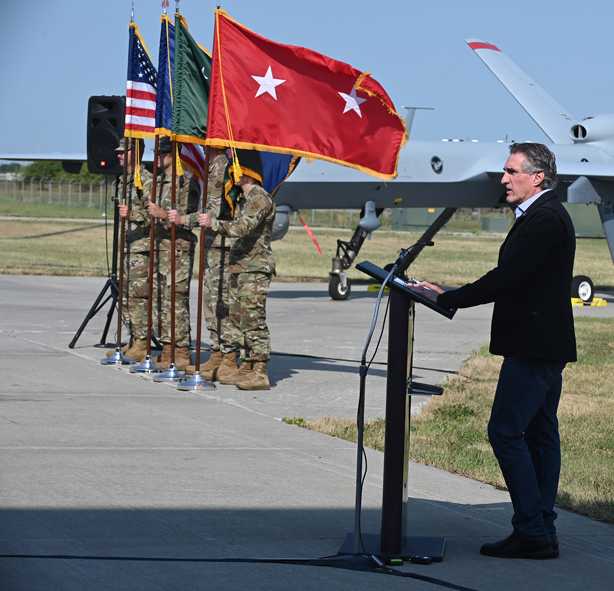 Governor Doug Burgum, commander and chief of the N.D. National Guard, renders remarks at the ceremonial groundbreaking for a consolidated operations facility at the Air National Guard Base, Fargo, August 24, 2021.