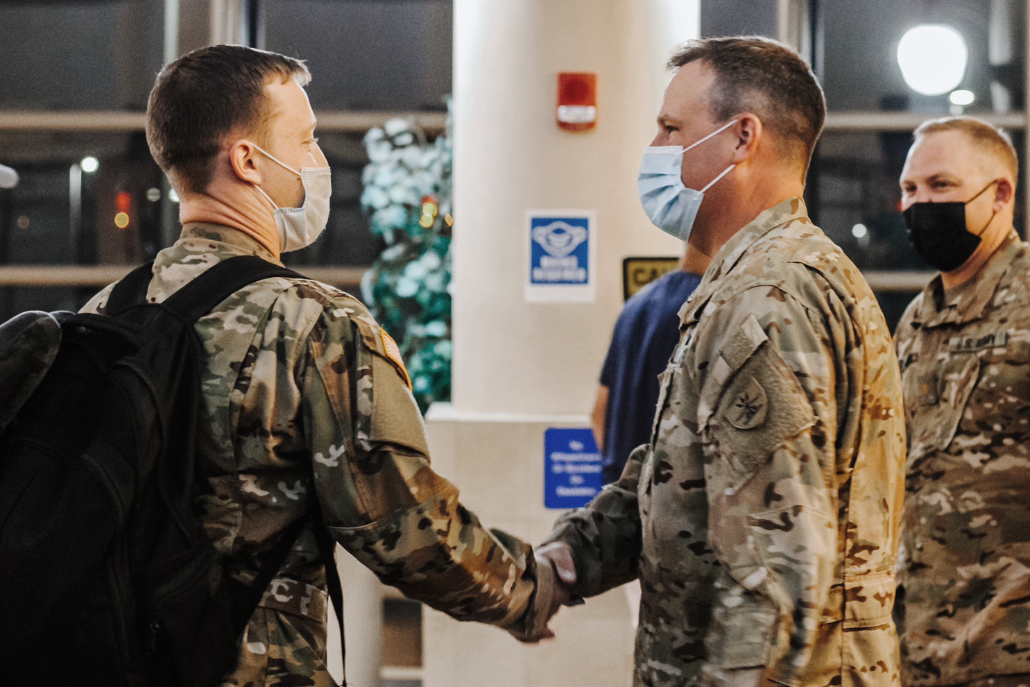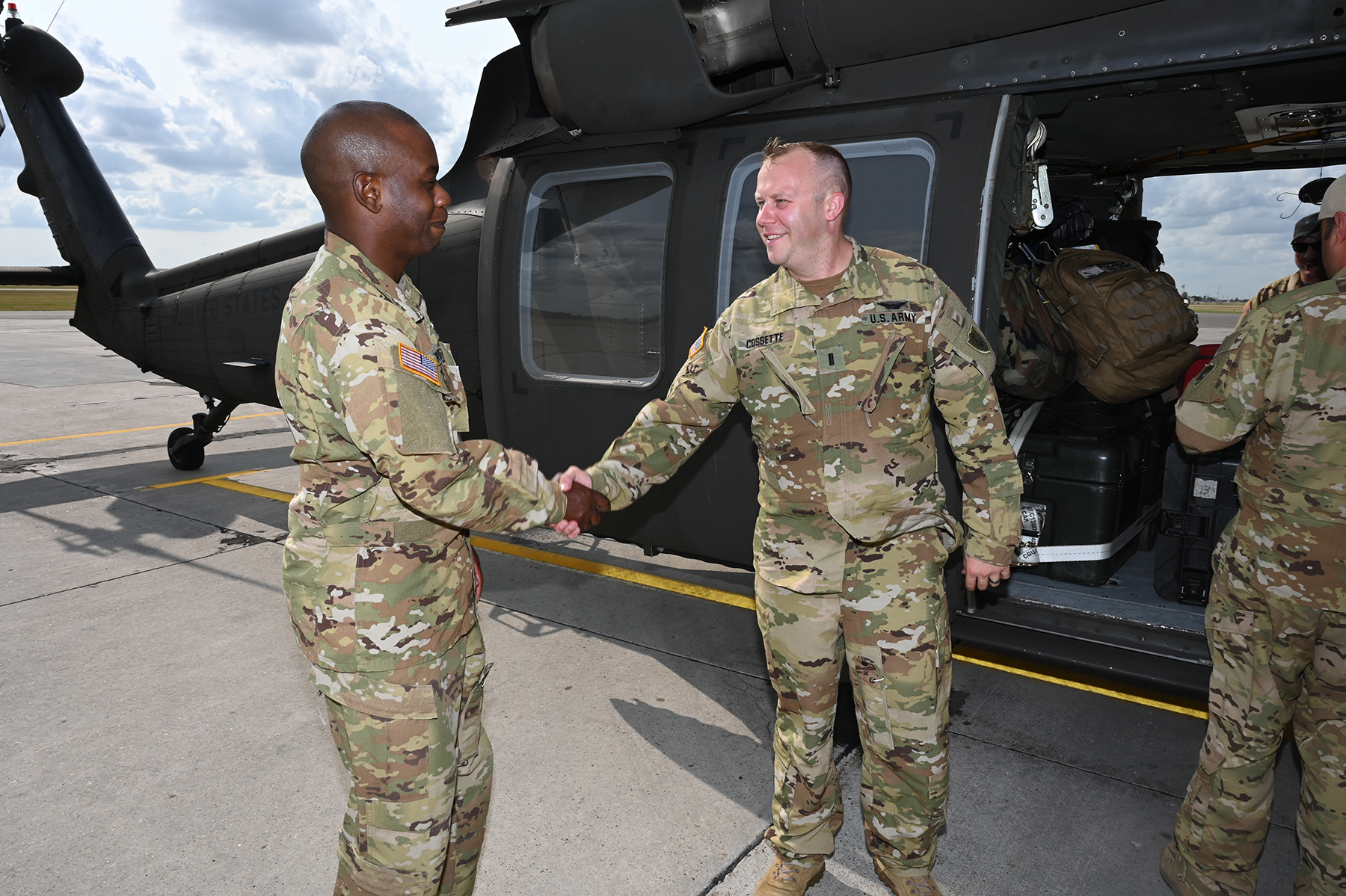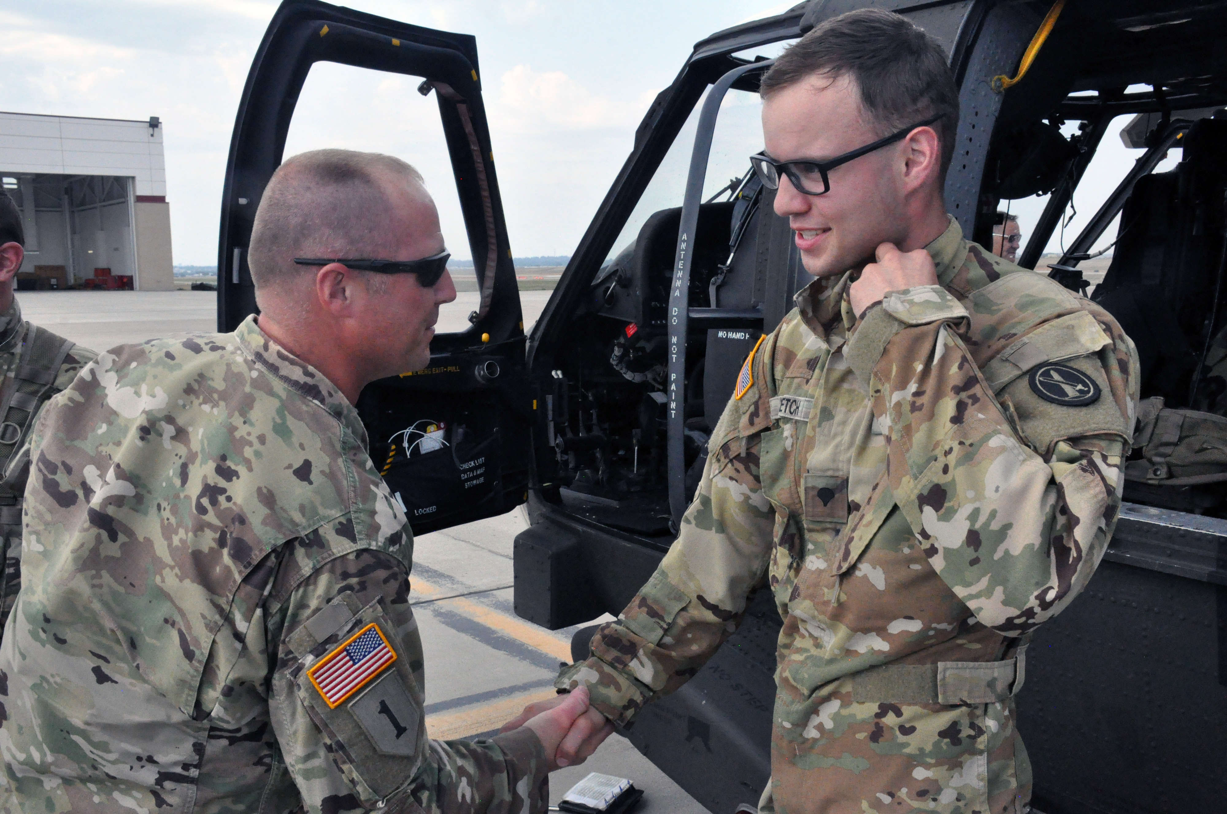 Lieutenant Colonel Mike Green, commander of the 1st Battalion, 112th Aviation Regiment, right, welcomes 1st Lt. Steven Schaffner, Company C, 2nd Battalion, 285th Aviation Regiment, at the Bismarck airport, Bismarck, August 21, 2021. (Photos courtesy of Courtney Schaffner)