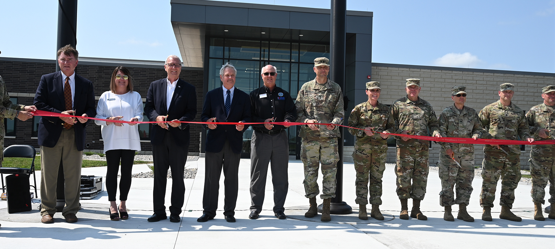Top photo: Major General Al Dohrmann, adjutant general for the N.D. National Guard (left of flag pole) leads a group of dignitaries during a ribbon cutting ceremony celebrating the dedication of the N.D. National Guard’s Fargo Readiness Center, Fargo, N.D., August 24, 2021. From left, Shawn Dobberstein, executive director of Fargo's Municipal Airport Authority; Mary Christy, representative for U.S. Congressman Kelly Armstrong; Sen. Kevin Cramer; Sen. John Hoeven; Delton Steele, honorary commander for the N.D. National Guard and chair of the N.D. Employer Support of the Guard and Reserve (ESGR); Dohrmann; Brig. Gen. Jackie Huber, deputy adjutant general, N.D. National Guard; Brig. Gen. Leo Ryan, commander, N.D Army National Guard; Col. Paul Harron, U.S. property and fiscal officer; Command Sgt. Maj. Eric Binstock, senior enlisted leader, N.D. National Guard; and Command Sgt. Maj. Derek Heck, state command sergeant major for the N.D. Army National Guard. (National Guard story and photos by Chief Master Sgt. David Lipp, 119th Wing)