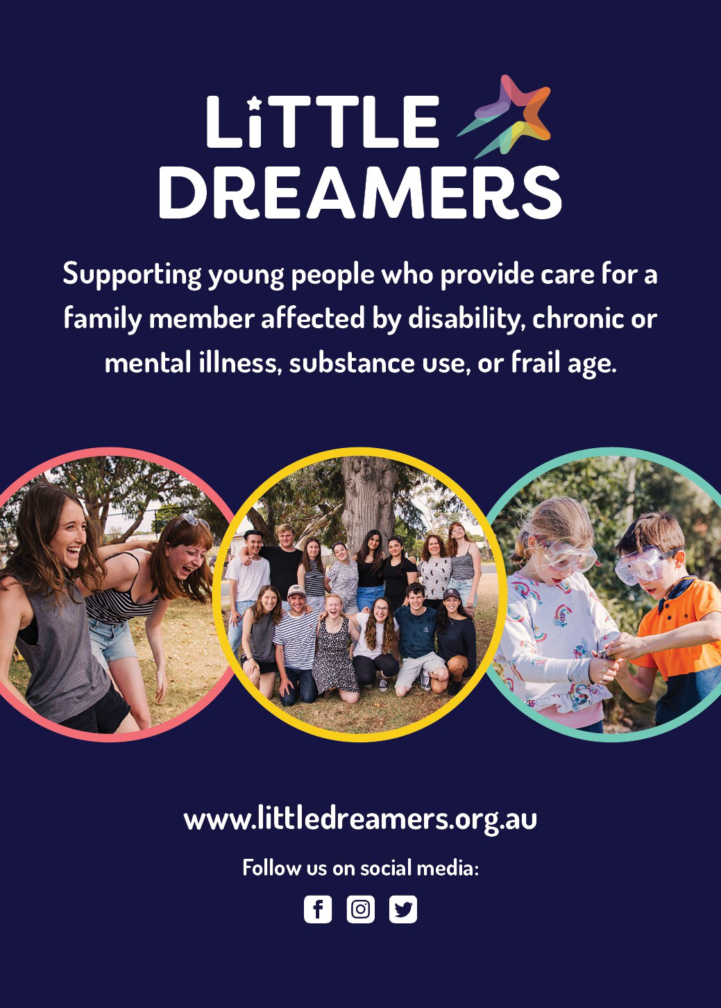 Little Dreamers is a not for profit organisation that supports Young Carers and special needs siblings, and we are now offering programs on the North Coast. We provide a range of support programs with a focus on sense of identity, health & wellbeing, social connectedness, education, respite & mentorship: https://www.littledreamers.org.au