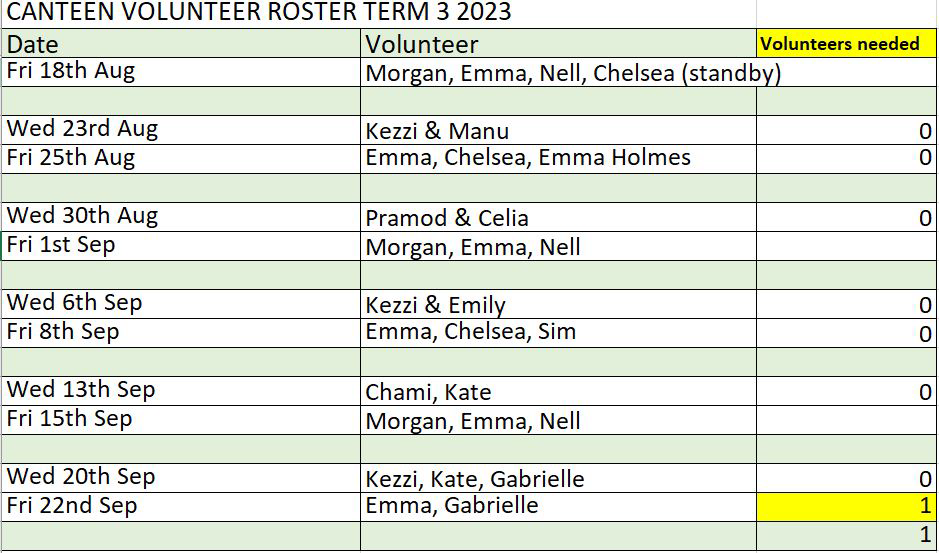 CANTEEN VOLUNTEER ROSTER - TERM 3 2023