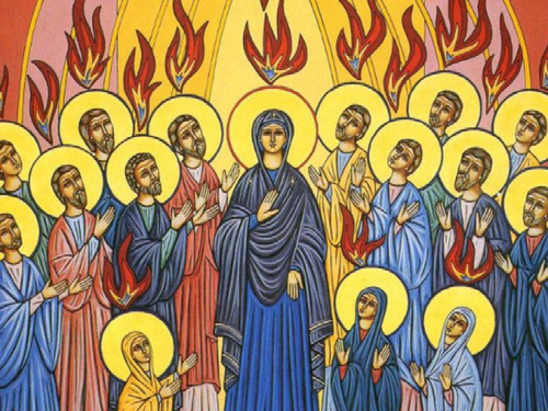 Mentre stava compiendosi il giorno della Pentecoste, si trovavano tutti insieme nello stesso luogo. Venne all’improvviso dal cielo un fragore, quasi un vento che si abbatte impetuoso, e riempì tutta la casa dove stavano. Apparvero loro lingue come di fuoco, che si dividevano, e si posarono su ciascuno di loro, e tutti furono colmati di Spirito Santo e cominciarono a parlare in altre lingue, nel modo in cui lo Spirito dava loro il potere di esprimersi.