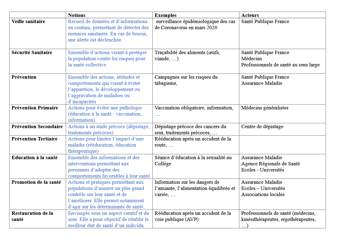 Principales notions : Veille et sécurité sanitaire - promotion de la santé, éducation pour la santé, prévention, restauration de la santé