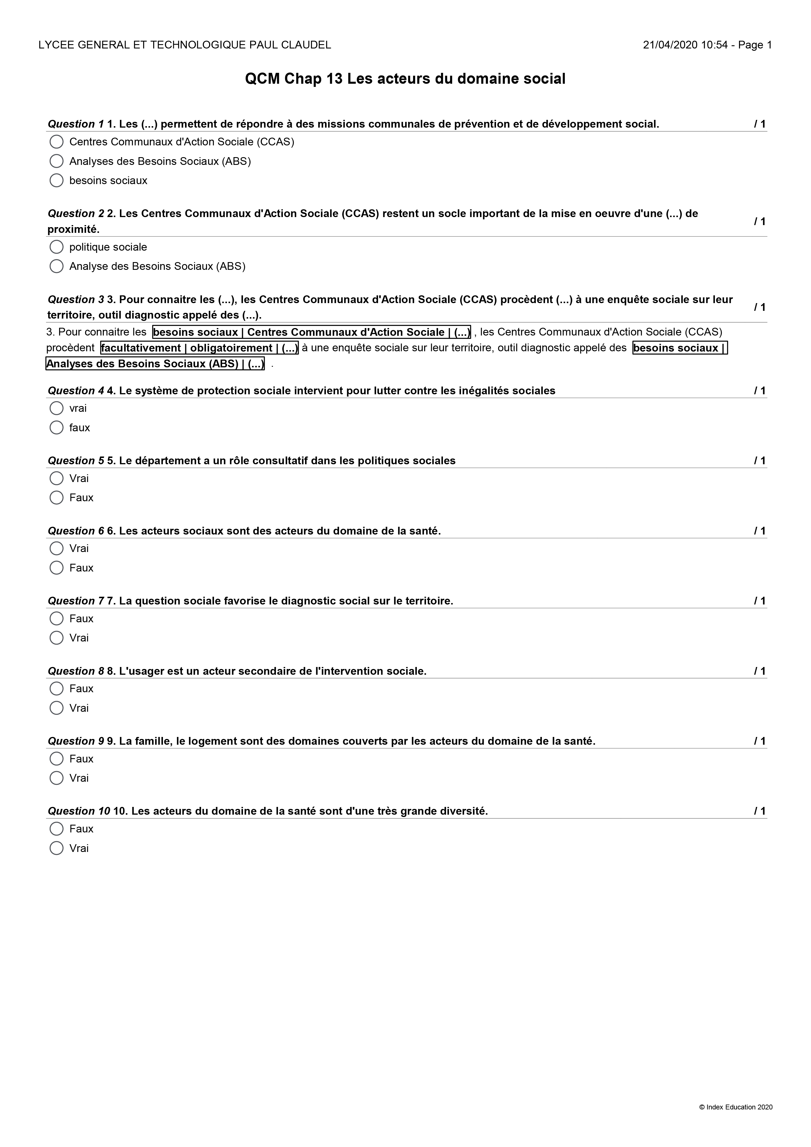 Exemple de question de baccalauréat s'appuyant sur un dossier documentaire (2020) : Le dispositif Garantie jeunes s'adresse aux jeunes âgés de 16 à 25 ans révolus, qui ne sont ni en emploi, ni en études, ni en formation et qui sont en situation de précarité. Démontrer que le dispositif « Garantie jeunes » s'appuie sur différents modes d'intervention sociale. Critères d'évaluation : 1) Mobiliser les connaissances : Très insuffisant / Insuffisant / Acceptable / Maitrisé 2) Exploiter avec pertinence les documents du dossier : Très insuffisant / Insuffisant / Acceptable / Maitrisé 3) Développer une analyse, une argumentation ou une synthèse : Très insuffisant / Insuffisant / Acceptable / Maitrisé