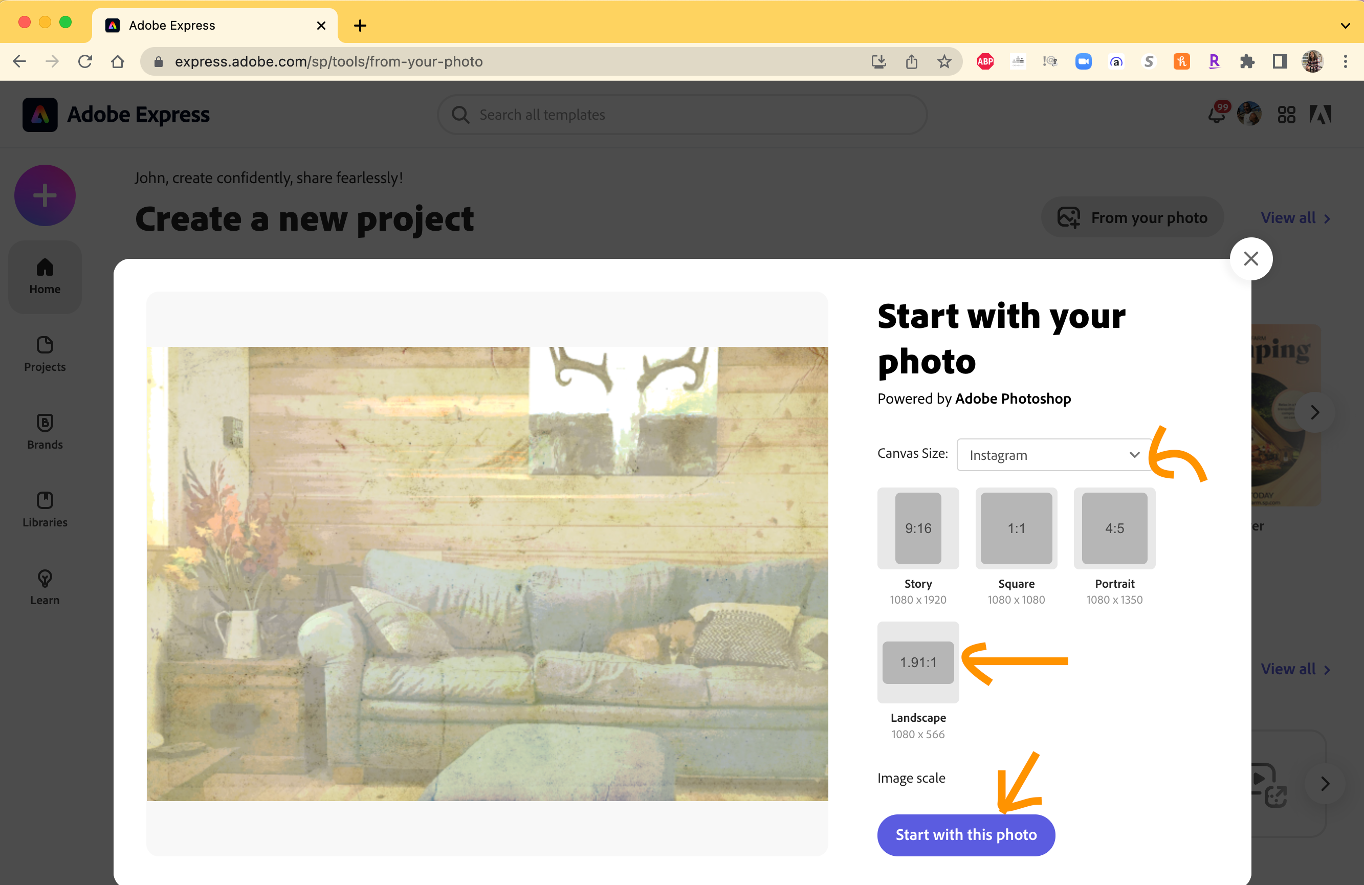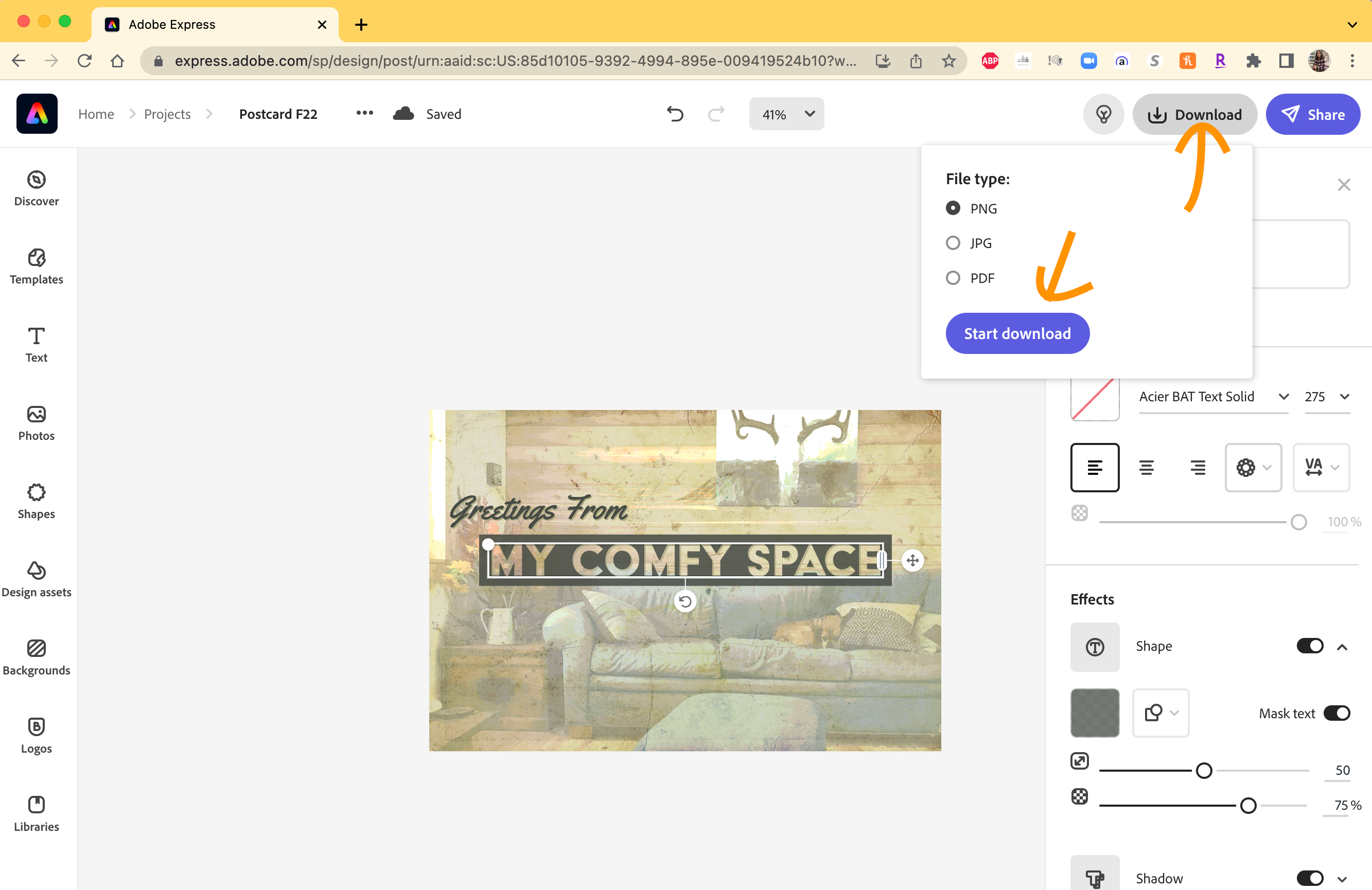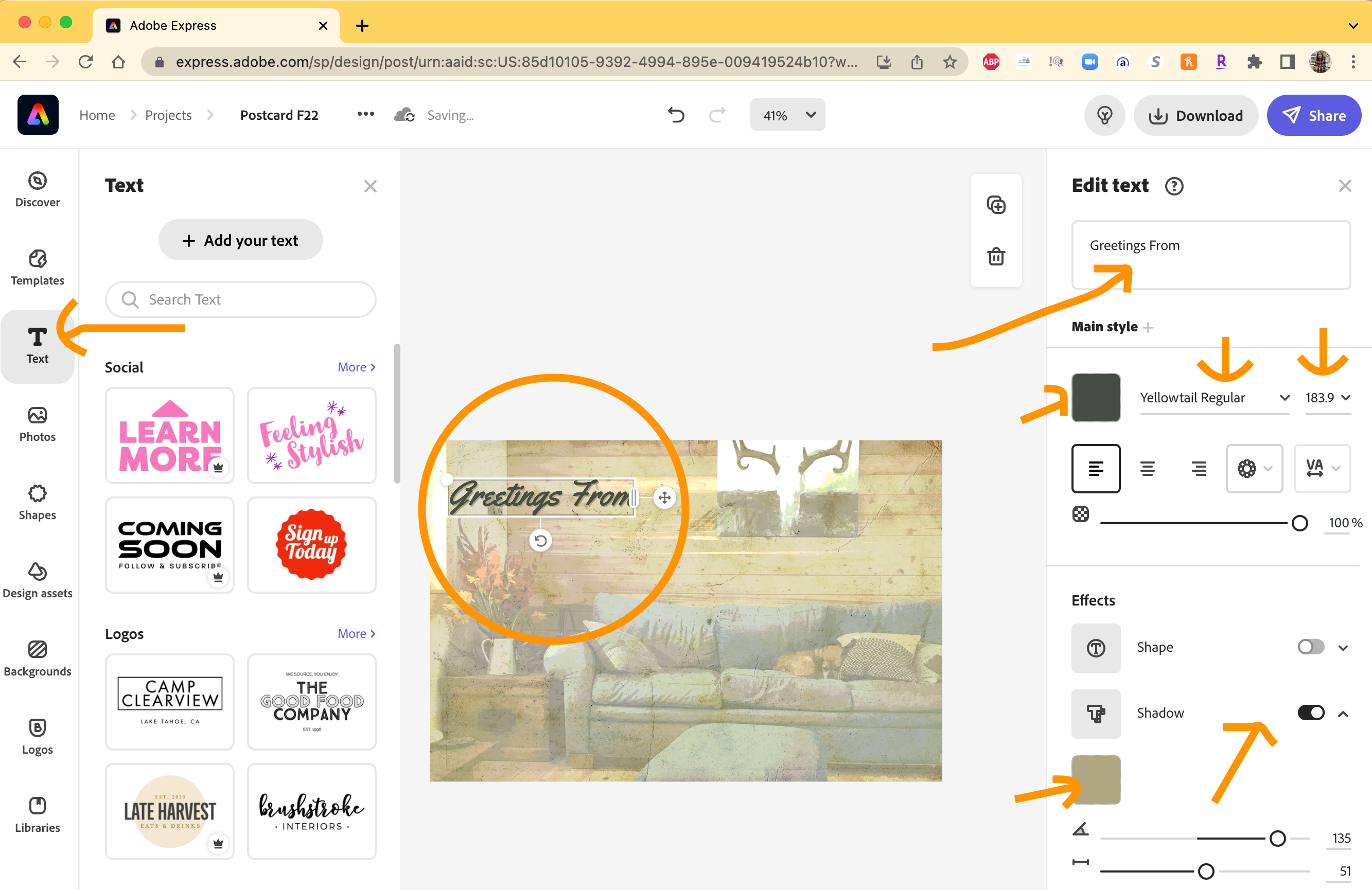 Open Adobe Express on your web browser and create a new project. You will be adding text by following the steps below. Once the image is complete share your postcard on the #design-fundamentals Slack Channel.