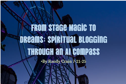 I chose the Ferris wheel, colorful flags, and popcorn theme because it fit my background experience. For many years, I have been a professional entertainer. My specific entertainment is that of a magician and balloon artist. Seeing the excitement, anticipation, and applause has kept me performing a long time. With my tools of trickery, sleight of hand, and balloon artistry I have entertained crowds from children to senior citizens. In every performance, you are weaving a story for those you are entertaining. What does this have to do with spiritual blogging, social media, dreams, journaling, or AI you ask? Well, keep reading to find out....
