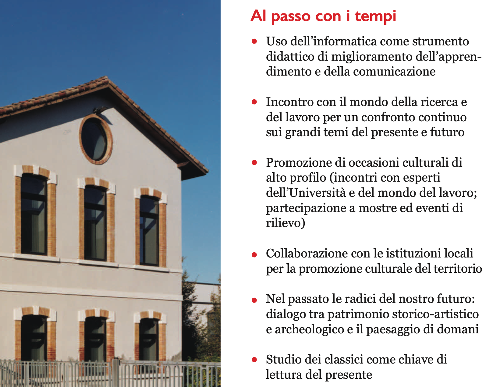 La nostra realtà, dinamica e innovativa, proiettata verso l’Europa, si concretizza in una scuola solida e ricca di esperienze e competenze. Offre una didattica flessibile che affianca l’utilizzo della più moderna strumentazione scientifica a metodologie d’avanguardia in ogni disciplina. Tutti gli indirizzi preparano gli studenti ad affrontare gli studi universitari con conoscenze sicure sia nell’ambito umanistico sia in quello scientifico, come certificato anche da rilevazioni esterne alla scuola.