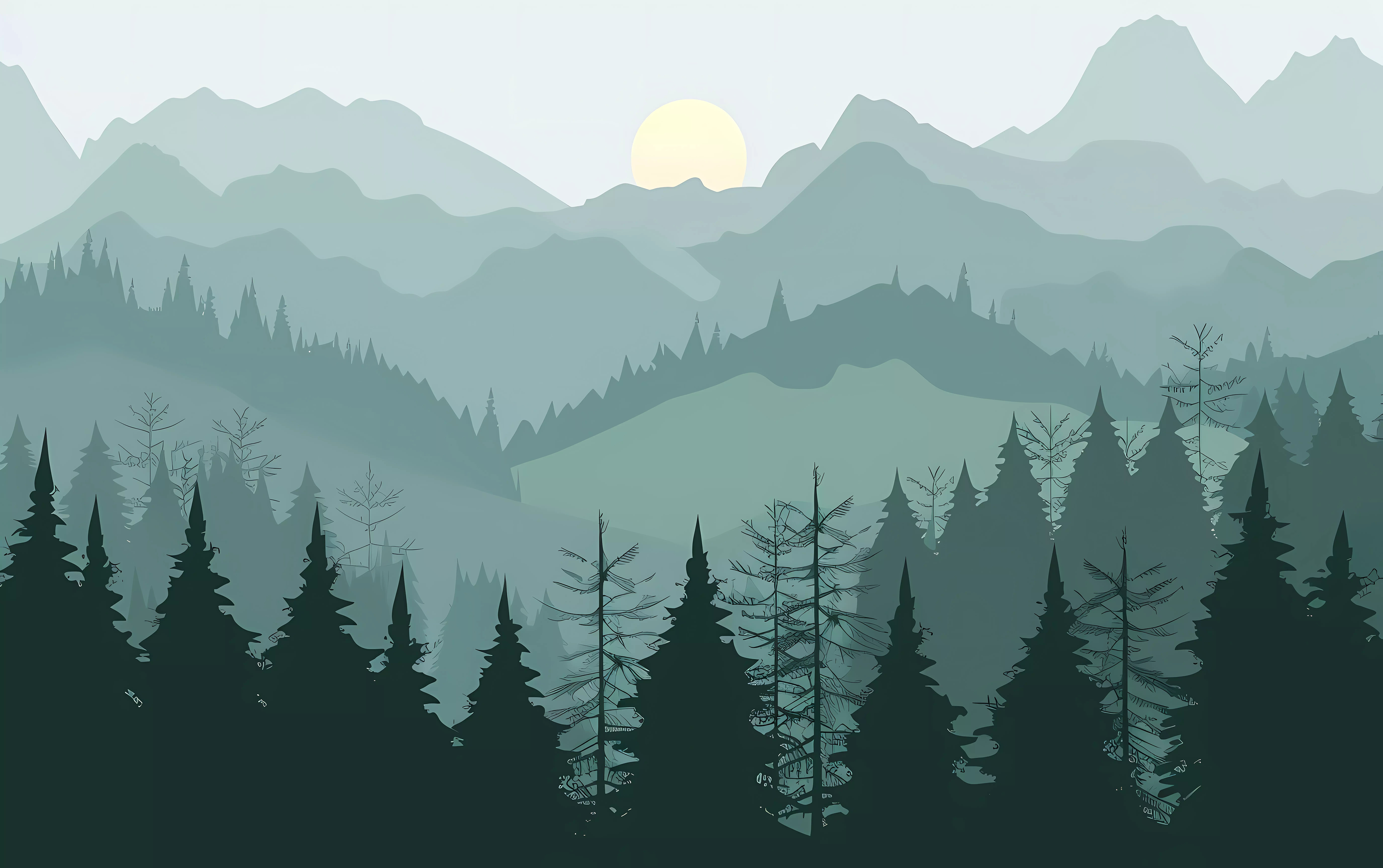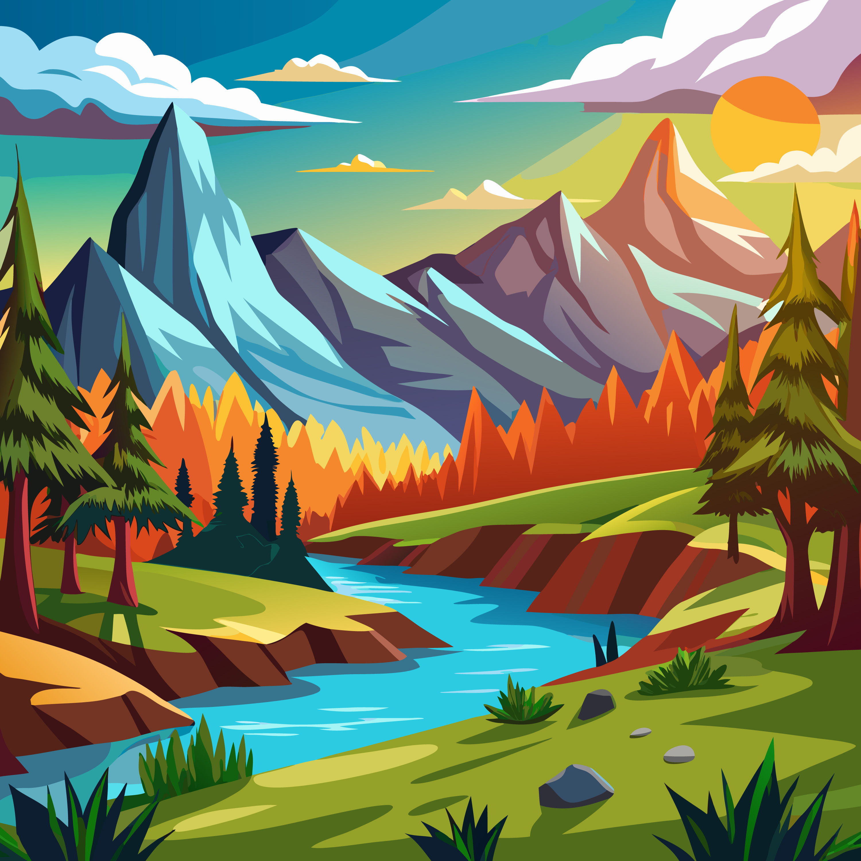 Created with images by KBL Sungkid - "A flat vector illustration of a forest landscape with mountains in the background, minimalistic design, vector art, grey and green color palette" • Printdesign 123 - "Landscape mountains waterfall hiking to boating in a lush environment Ecotourism Customizable Flat Illustration"