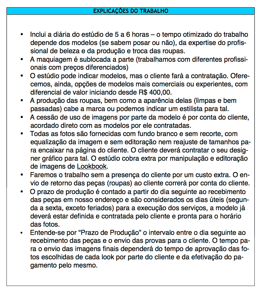 - Existem taxas extras que se aplicam a certos trabalhos. Os looks têm de ser feitos em uma diária de 6 horas ou marcado dias extras com acréscimo