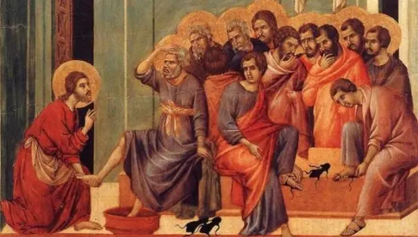Durante la cena, quando il diavolo aveva già messo in cuore a Giuda, figlio di Simone Iscariota, di tradirlo, Gesù, sapendo che il Padre gli aveva dato tutto nelle mani e che era venuto da Dio e a Dio ritornava, si alzò da tavola, depose le vesti, prese un asciugamano e se lo cinse attorno alla vita. Poi versò dell'acqua nel catino e cominciò a lavare i piedi dei discepoli e ad asciugarli con l'asciugamano di cui si era cinto.