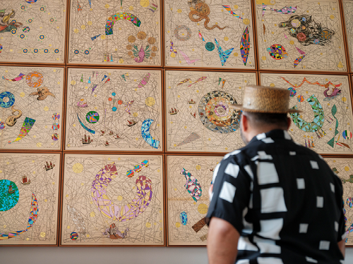 Image credit: Hormazd Narielwalla with his newly installed mural, Expanding universe © Haydon Perrior