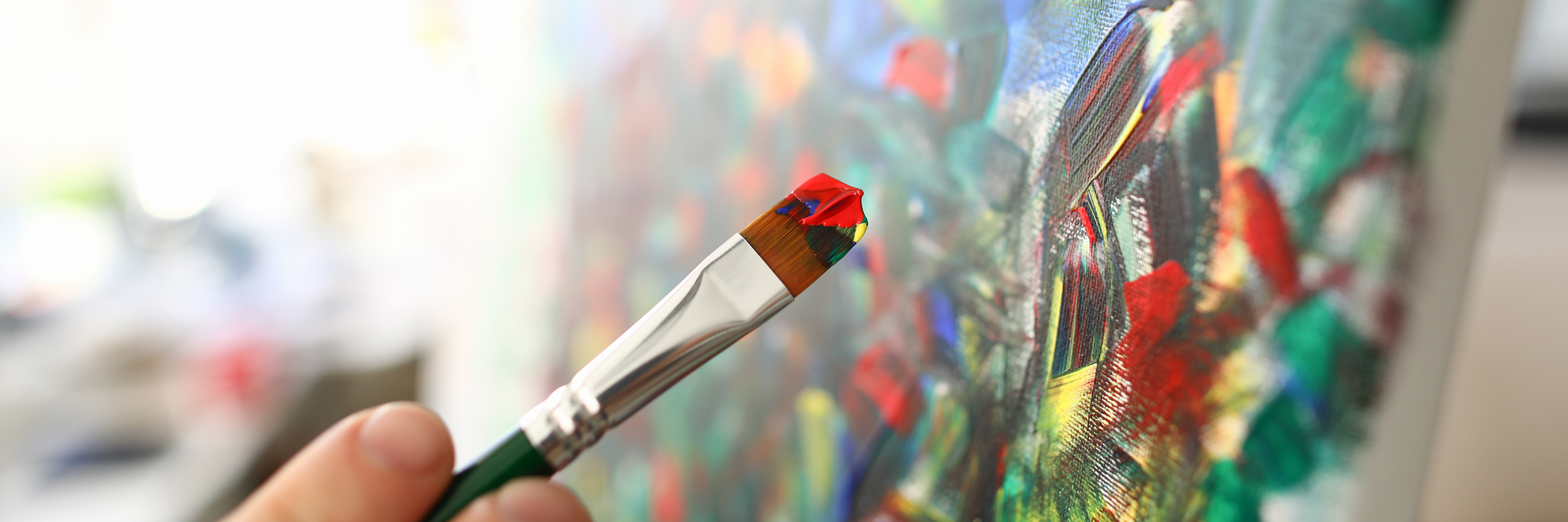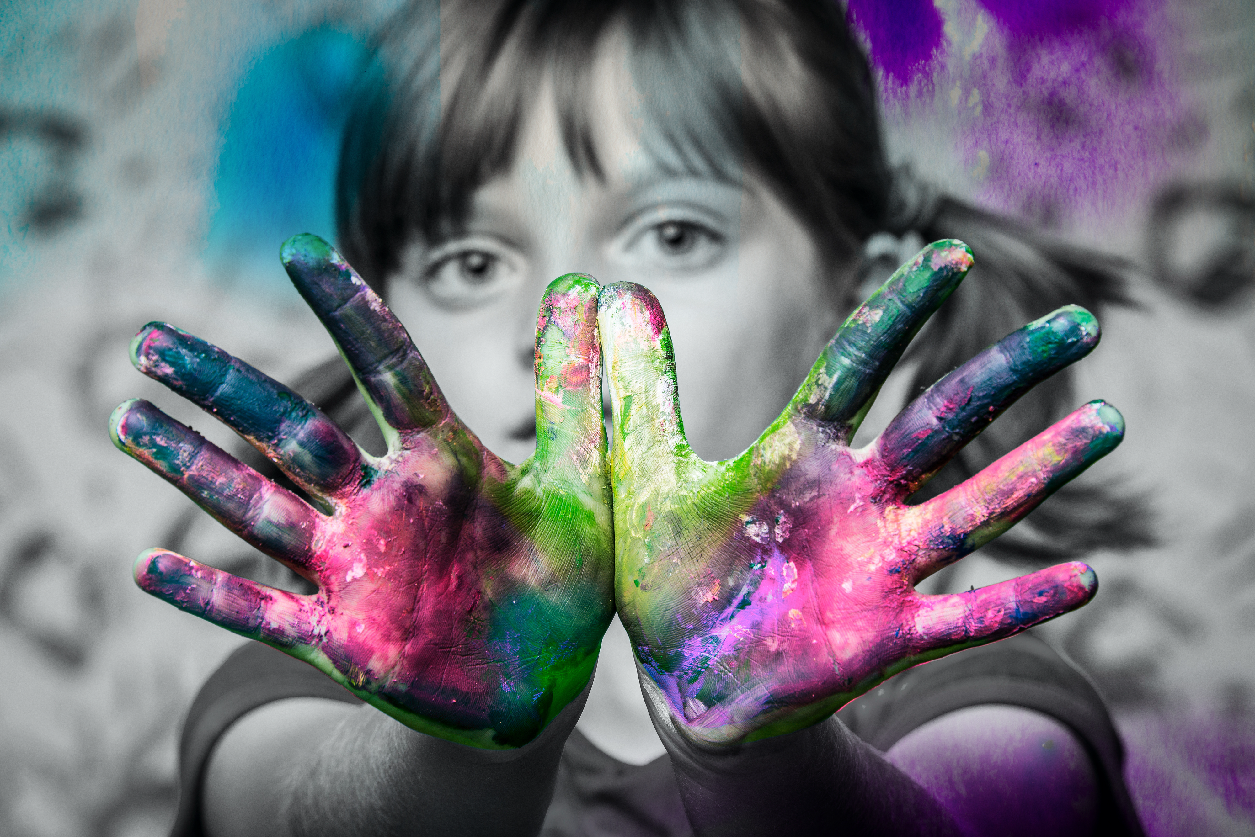 Created with images by vectorfusionart - "Composition of painting brushes on white background with copy space" • H_Ko - "Hand holds brush with watercolors and paints picture" • Africa Studio - "Color kids hands art background" • master1305 - "Unmanageable rhythm of life, speed of decision-making. Young girl's portrait with colorful bright abstract graphics, lines. Contemporary art collage."