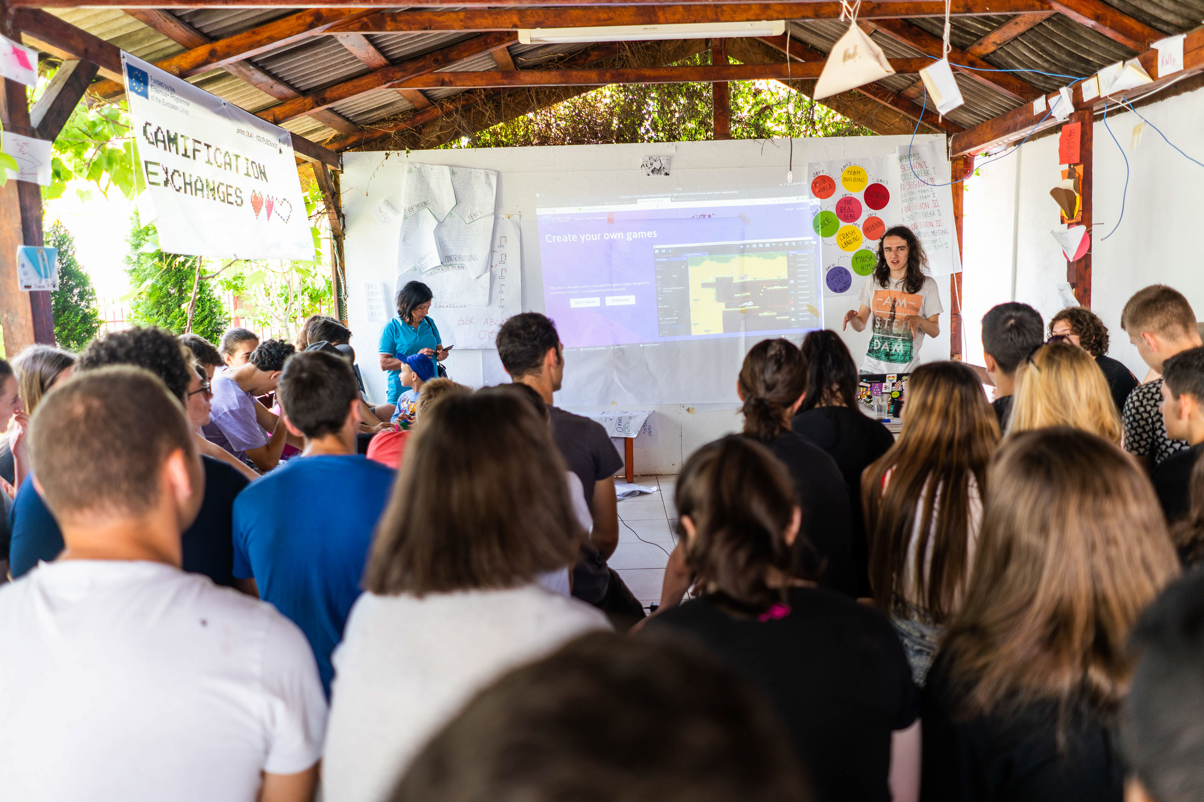 După activitățile inițiale de team building, participanții au intrat direct în etapa de programare. Alex Mitan, facilitatorul proiectului, le-a explicat liniile generale de abordare a strategiilor de design, creare și extindere a jocurilor, apoi a insistat mai mult asupra fiecărui detaliu component, de exemplu, cum se poate crea o entitate, cum este gândit designul de personaj (prieten sau inamic), cum sunt plasate entitățile în scenarii cu derulare logică, secvențială sau arborescentă și cum se construiește grafic fiecare etapă, continuând cu abordarea animațiilor pentru personaje și spațiile în care acestea evoluează – împreună cu povestea jocului - , cum se acordă procentajul pentru fiecare dintre caracteristicile personajelor (de exemplu, viață și echipament).