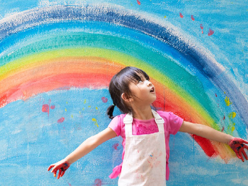 Created with images by Sukjai Photo - "Asian little girl is painting the colorful rainbow and sky on the wall and she look happy and funny, concept of art education and learn through play activity for kid development." • p-fotography - "heart shape tie dye pattern hand dyed on cotton fabric abstract texture background." • AungMyo - "Two cute little girls playing on mountain park with air balloons at sunset. Best friends."
