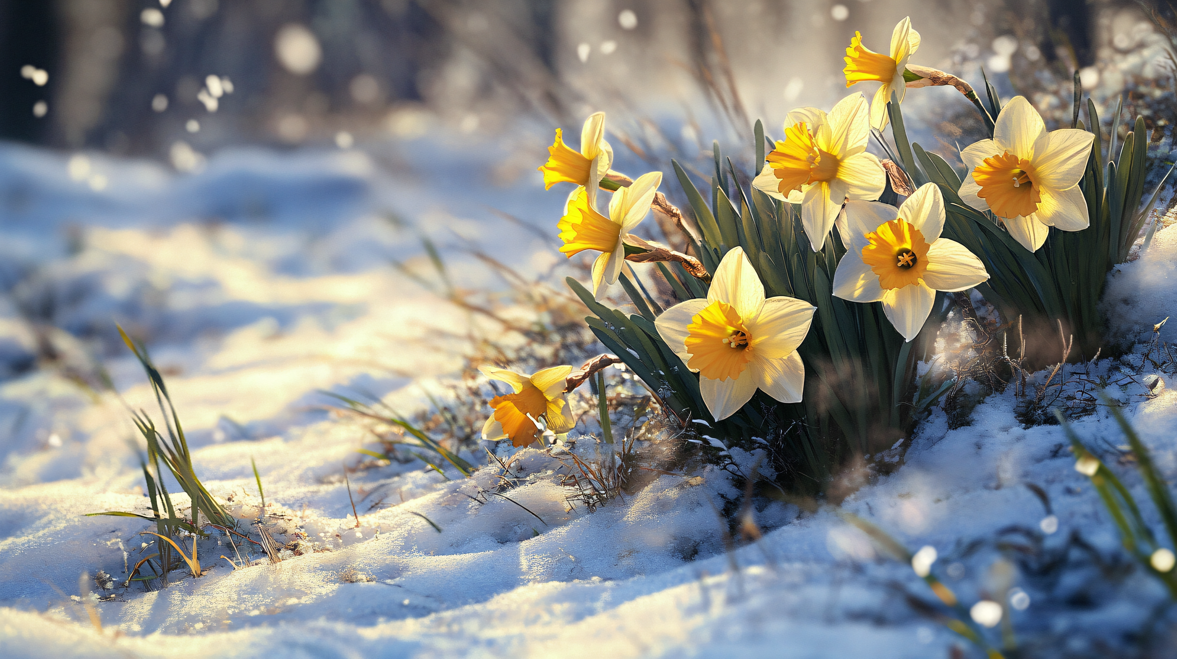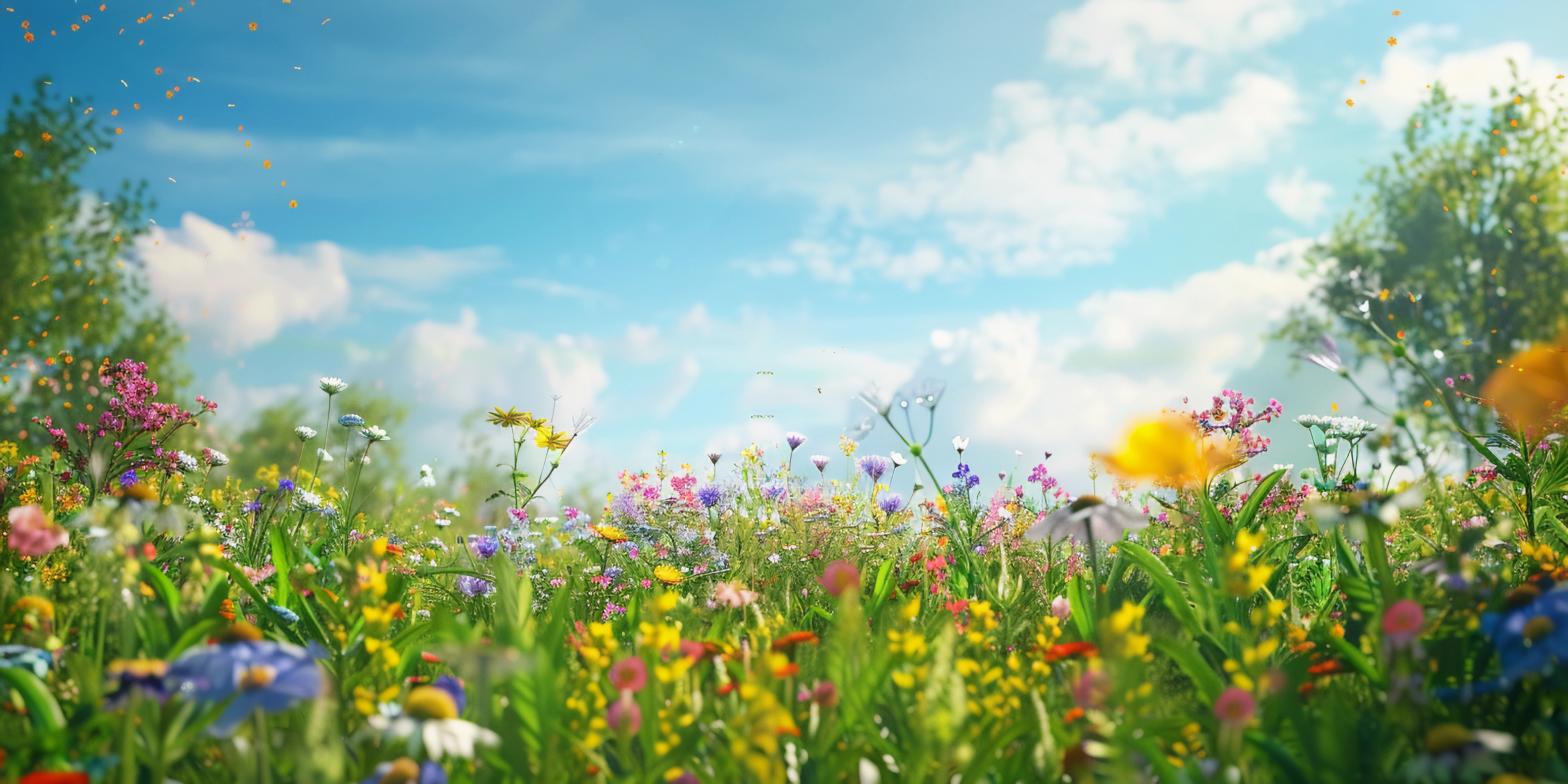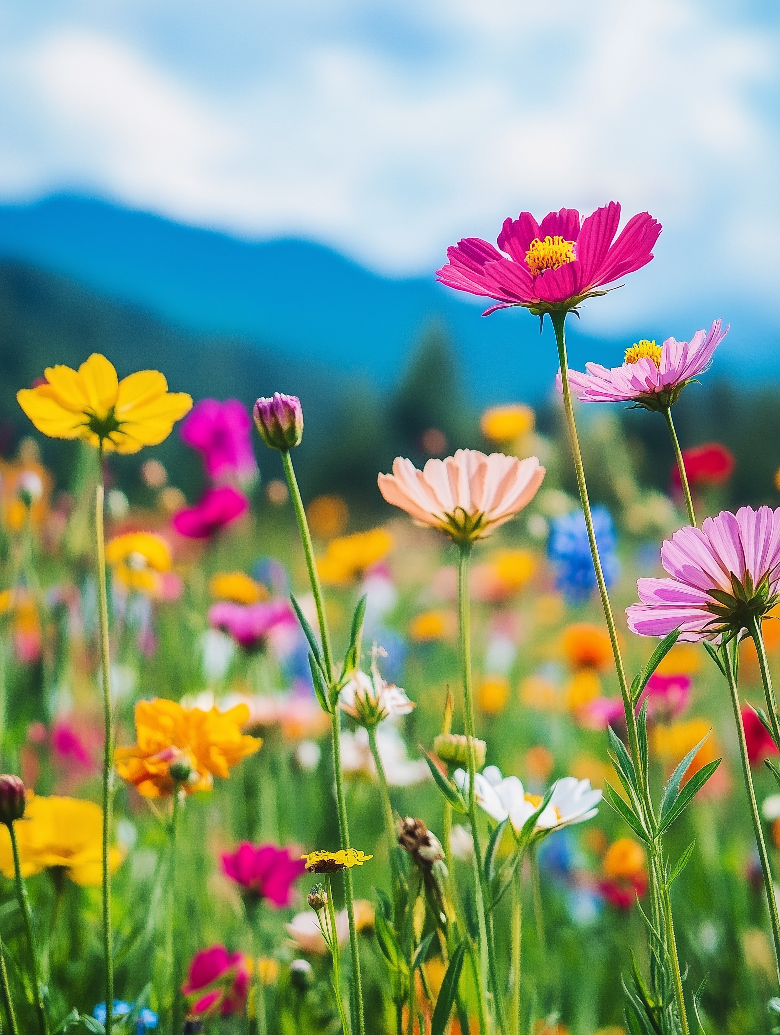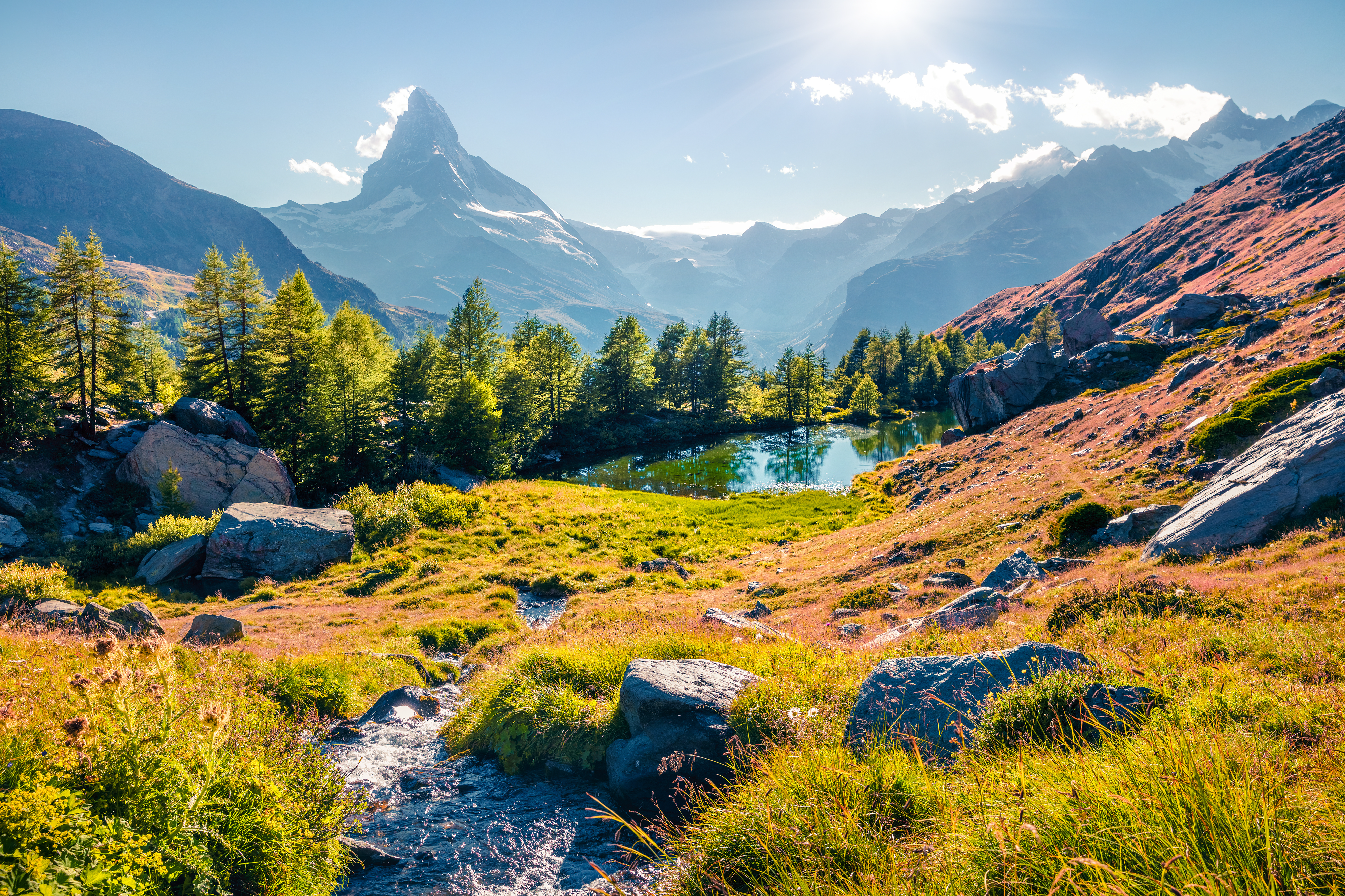 Created with images by Andrew Mayovskyy - "Sunny summer scene of Grindjisee lake. Beautiful morning view of Matterhorn (Monte Cervino, Mont Cervin) peak, Swiss Alps, Zermatt location, Switzerland. Beauty of nature concept background." • Maryna Osadcha - "Green grass and chamomile in the meadow. Spring or summer nature scene with blooming white daisies in sun glare." • yaks17 - "charming meadows with vibrant wildflowers" • Kristina - "A vibrant scene showcasing the first signs of spring, with blooming flowers such as crocuses and daffodils pushing through the thawing ground. " • MicroTee - "Multicolor Cosmos meadow field spring" • Sarunya - "A tranquil scene of a field of yellow tulips, gently swaying in the spring breeze, with soft sunlight casting a warm glow over the flowers and surrounding grass" • Sinechana - "10.A group of daffodils emerges from a snow-covered ground, their bright yellow blooms glowing under the warm rays of the spring sun. The surrounding snow begins to melt as the scene transitions from"