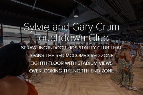 Sylvie and Gary Crum Touchdown ClubSprawling indoor hospitality club that spans the red McCombs Red Zone eighth floor with stadium views overlooking the north end zone