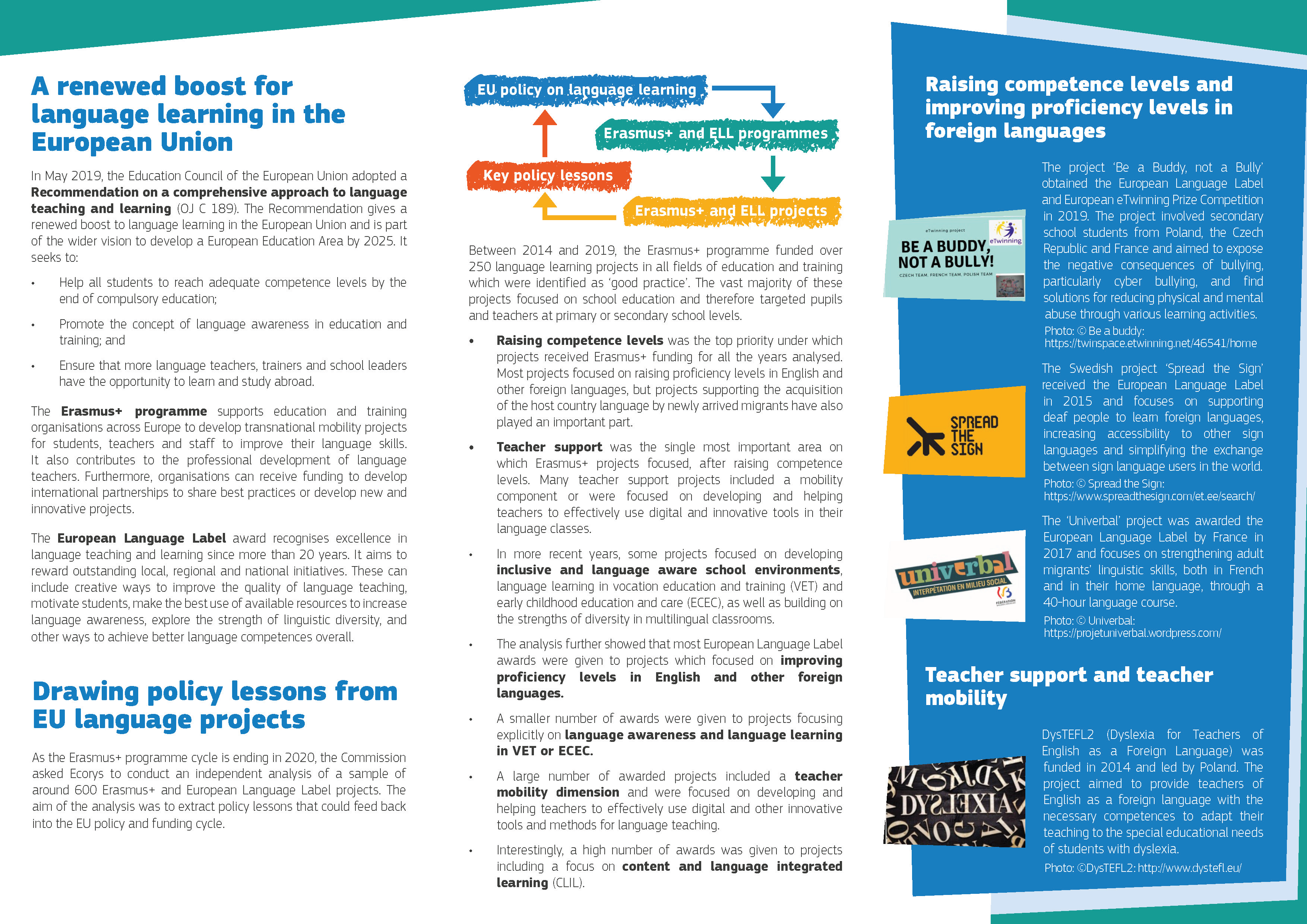În mai 2019, Consiliul pentru Educație al Uniunii Europene a adoptat o recomandare privind abordarea cuprinzătoare a predării și învățării limbilor străine (JO C 189). Recomandarea dă un nou impuls învățării limbilor străine în Uniunea Europeană și face parte din viziunea mai largă de dezvoltare a unui Spațiu European al Educației până în 2025. Ea urmărește: • Să îi ajute pe toți cei care învață să atingă niveluri adecvate de competență până la sfârșitul educației obligatorii; • Să promoveze conceptul de conștientizare a utilității dezvoltării competențelor lingvistice în educație și formare; • Să garanteze că mai mulți profesori de limbi străine, formatori și directori de școli au posibilitatea de a învăța și de a studia în străinătate.