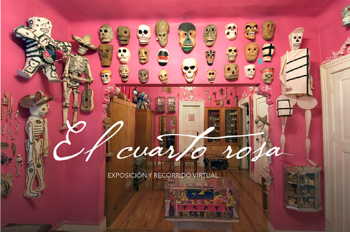 Y ¿por qué el Cuarto Rosa? Ruth dormía con la muerte. Entre paredes y cortinas “rosa mexicano” – color con el que Ruth identificaba a los mexicanos- y detalles blancos contrastantes, se encontraba la creatividad y habilidad de los artesanos al plasmar el arte popular vinculado a la Muerte en diversos materiales como la madera, la cartonería, el papel, el metal, el dulce o el barro, entre otros. Tanto máscaras rituales como piezas figurativas llenas de ingenio e ironía tapizaban los muros y los entrepaños de numerosas vitrinas.
